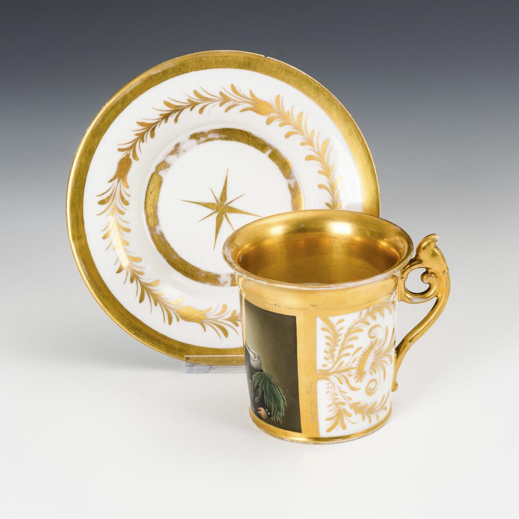 Kratertasse mit Rocaillehenkel. Schauseitig eine Rechteckkartusche mit der Darstellung eines sächsischen Forstmeisters. Haarriss und Bestoßung am Untertassenrand, partieller Goldabrieb.