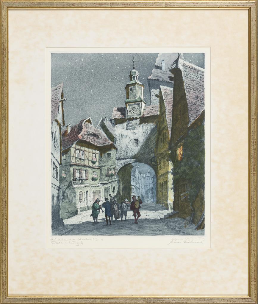 Romm, K.: Blick vom Rheinufer auf den Kölner Dom, Lithografie, verglast und gerahmt: 49,5 x 73,5 cm | Böhme, Hans: "Ständchen am Markusturm. Rothenburg", Farbradierung, Platte: 31,5 x 26,5 cm, verglast und gerahmt: 51,5 x 44 cm.
