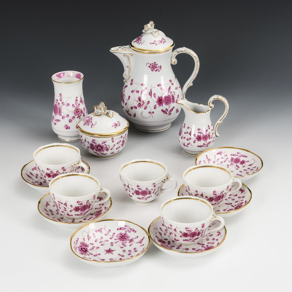 15 Teile. Mokkakanne (H 18 cm), Milchkännchen, Zuckerdose, Vase (diese Meissen), 5 Tassen und 5 Untertassen.