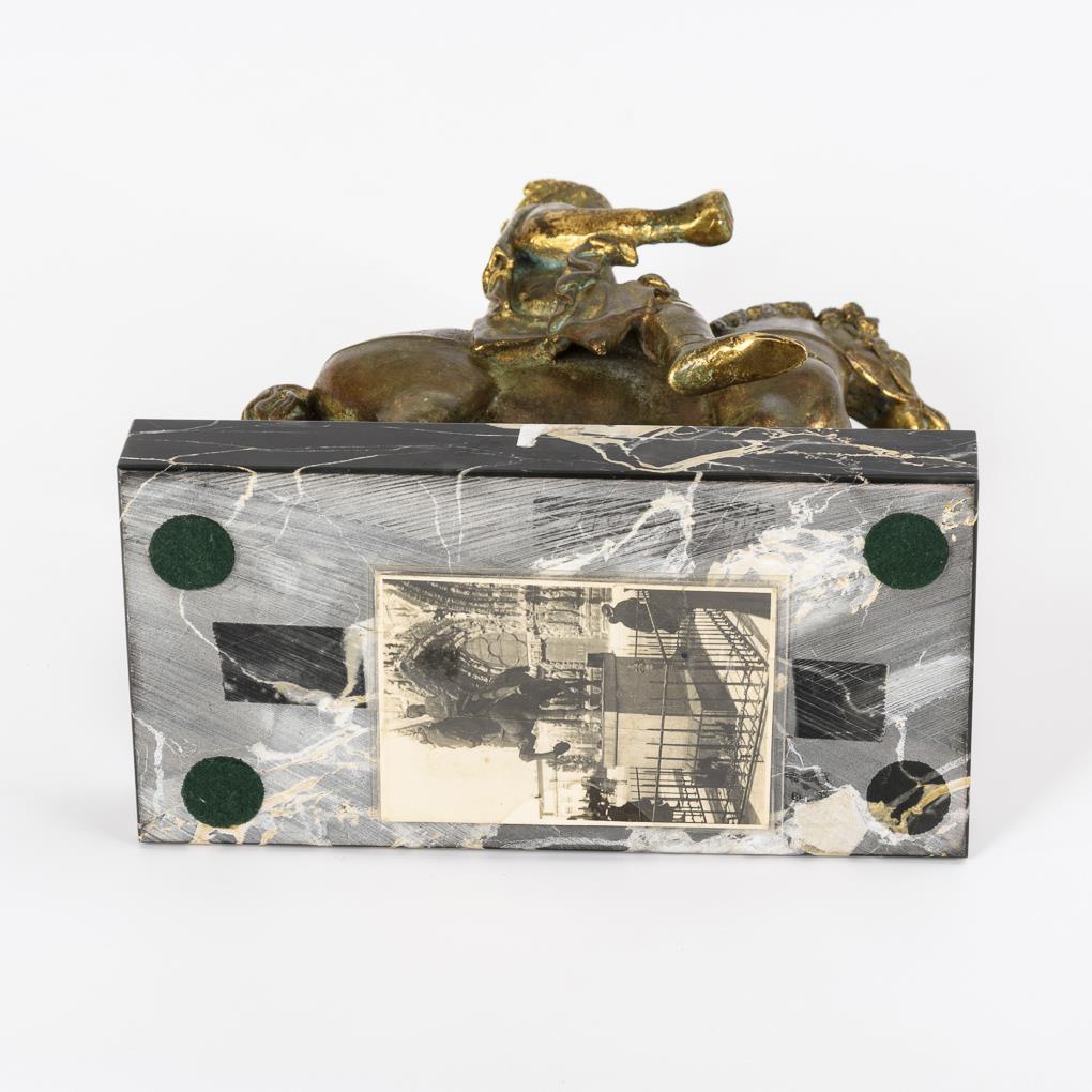 Bronze mit Resten einer Vergoldung, teils grünlich patiniert, schwarze Marmor-Plinthe. Unter der Plinthe Kupfer-Plakette der Gießerei ARA-Kunst mit Datum "1984" und Zählung "74/980". H 23 / 25,5 cm.
