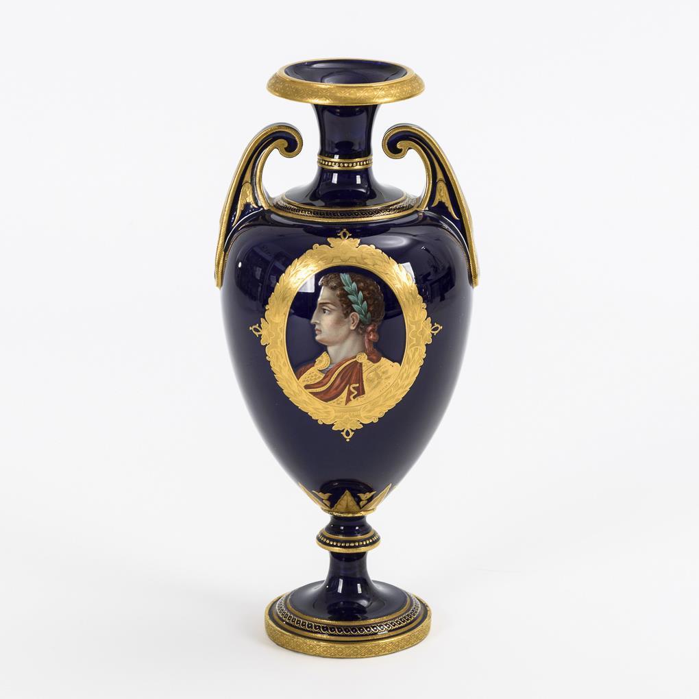Ovoide Vase mit zwei gebogten Henkeln und Kraterhals, Rundfuß. Schauseitig ein lorbeerumkränztes Medaillon, darin die bezeichnete Darstellung des Kaisers Augustus.