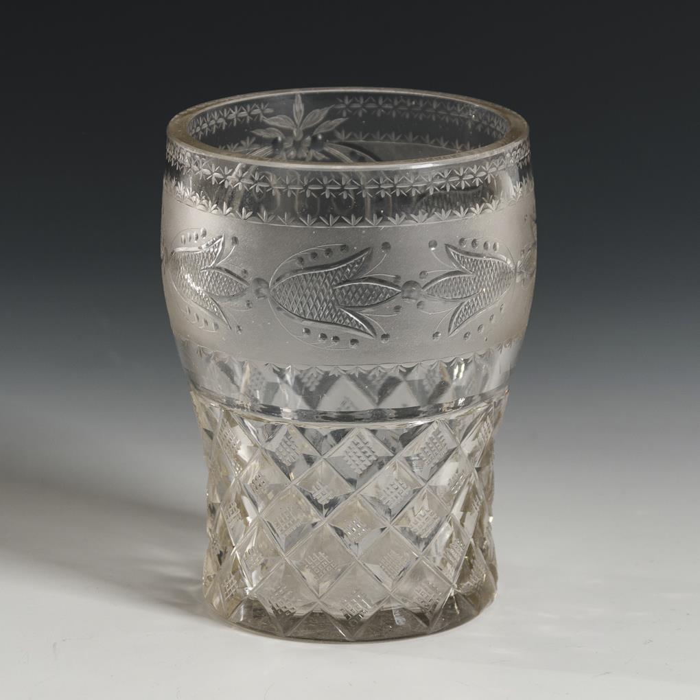 Becher mit reichem Steinelschliff und teils geblänkter Gravur, schauseitig ein Medaillon mit dem datierten Monogramm "C.S.G.".