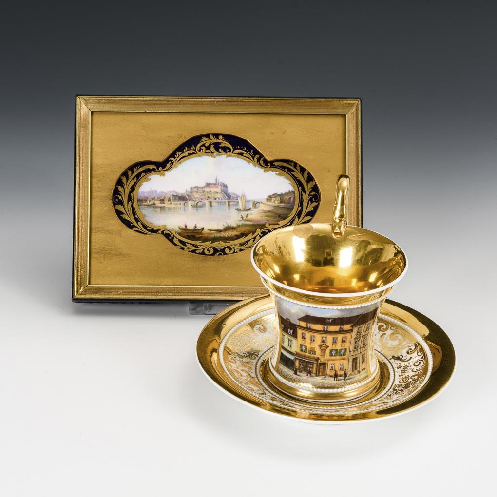 1x KPM Berlin, 1837-1844: Kratertasse (H 11 cm) mit Schlangenhenkel und originaler Untertasse (Ø 16 cm); schauseitig auf der Tasse die polychrom gemalte Ansicht des traditionsreichen Juweliergeschäftes Wilm in Hamburg. / 1x Meissen, um 1860-1918: in einen goldfarbenen Holzrahmen gefasstes Stück einer Platte mit Kobaltfond sowie einer Vierpasskartusche mit der Ansicht der Albrechtsburg in Meissen. Tassenhenkel geklebt.