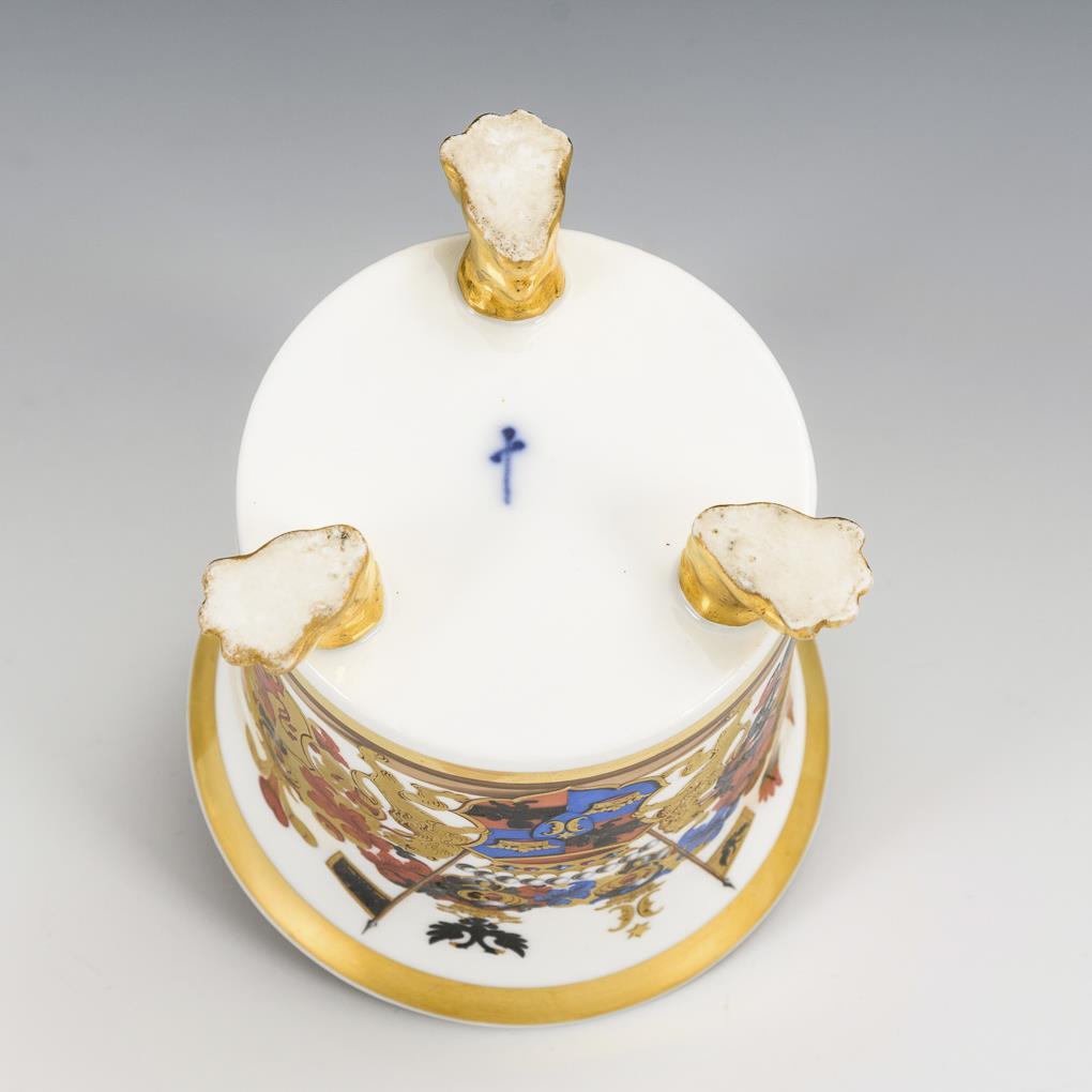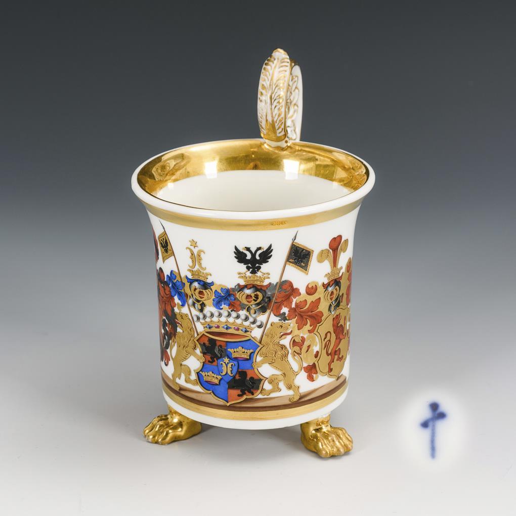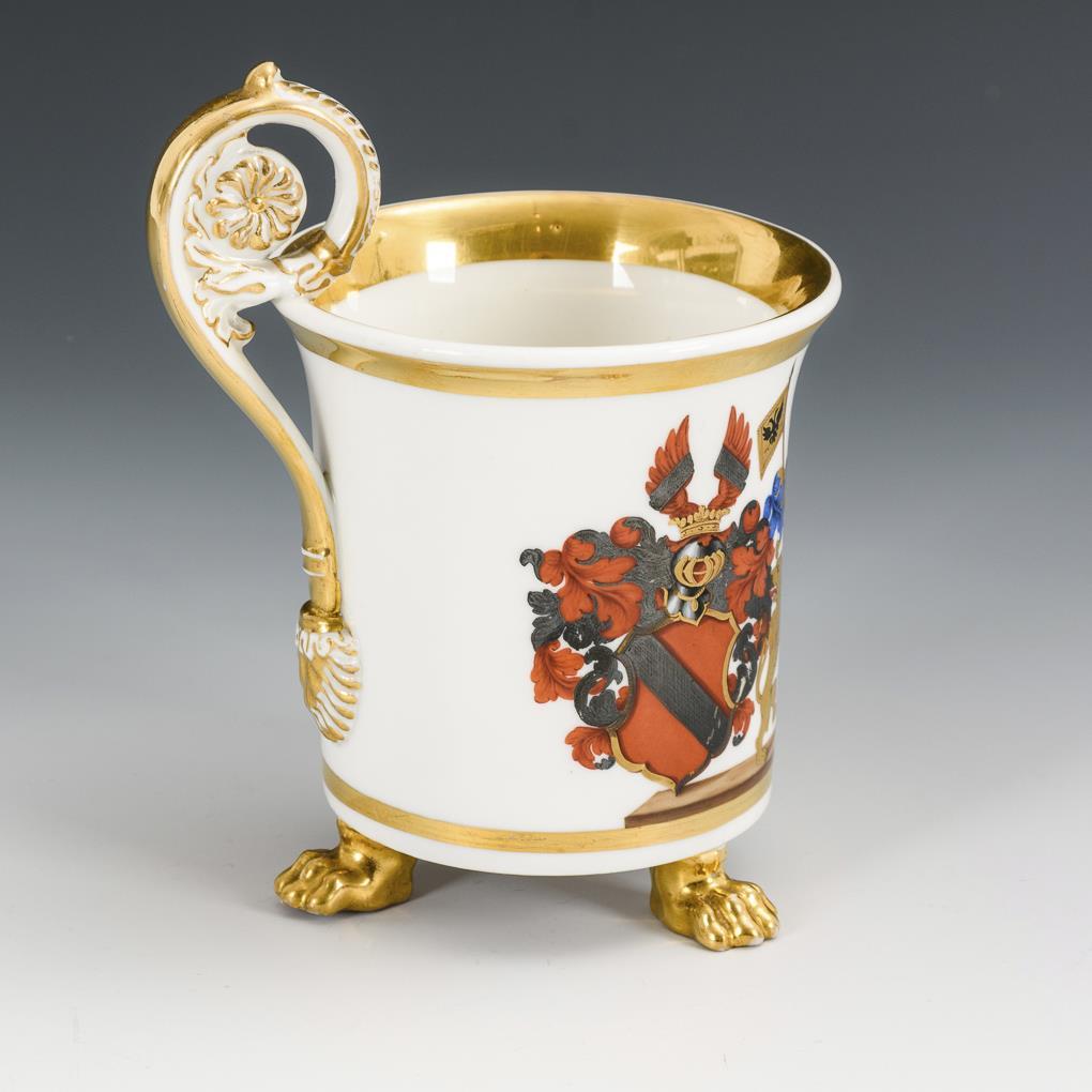 Zylindertasse mit Kraterrand, Rosettenhenkel und drei Tatzenfüßen. Schauseitig ein aufwendig gemaltes Wappen mit Grafenkrone. Ohne Untertasse. Minimaler Goldabrieb.