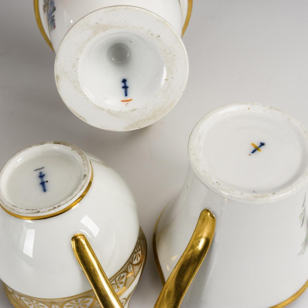 1x Tönnchentasse mit Innenvergoldung, schauseitig ein rosen- und weingerahmtes Medaillon mit der Inschrift "Genieße Freuden ungestört.". / 1x Kratertasse mit einem schauseitigen Blumenbukett sowie der Aufschrift "Zum Andenken". / 1x gefußte Glockentasse mit Innenvergoldung sowie einem goldradierten, von Rosen und Vergißmeinnicht überfangenem Wappenschild mit der Inschrift "Der Freundschaft heilig.". 1x minimaler Goldabrieb.