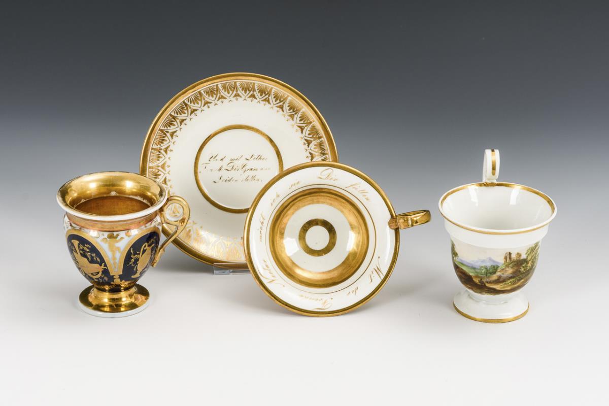 1x gefußte, schalenartige Tasse (H 7,5 cm) mit originaler Untertasse (Ø 13,5 cm): ornamentales Golddekor sowie die Aufschrift "Mit der Freude Nectar möcht ich sie Dir füllen" (Tasse) bzw. "Und mit Lether (?) Trank Dir Gram und Leiden stillen". / 1x gefußte Glockentasse mit kobaltblauem Teilfond und goldgemalten, teils radierten Putten und Symbolen (H 8 cm). / 1x gefußte Glockentasse mit Rosettenhenkel und schauseitiger Landschaftsmalerei (H 9,5 cm). 2x ohne Untertasse. Partieller Goldabrieb.