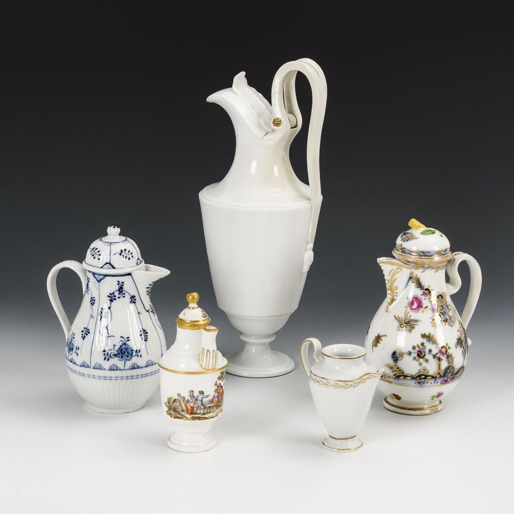 1x Wien: Birnkanne mit unterglasurblauer, farb- und goldstaffierter Kakiemonmalerei (H 18,5 cm). / 1x Limbach: gebrochen gerippte Birnkanne mit ausgetuschtem Strohblumendekor (H 17 cm). / 1x Höchst: Empire-Kännchen mit Bauernszene (H 14 cm). / 1x Dihl/Paris: Empire-Kanne mit Scharnierdeckel (H 31 cm). / 1x KPM: Empire-Kännchen mit Golddekor (H 9 cm). Henkel und Hals der Dihl-Kanne restauriert, Henkel des Höchst-Kännchens fehlt, Wien-Kanne mit je 1 Chip am Deckelrand und Stand, Gold etwas berieben.