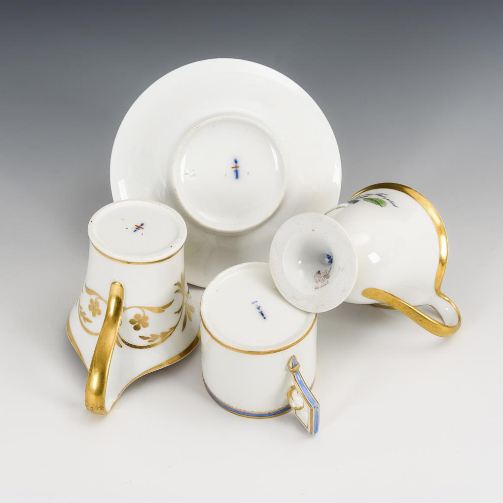 1x Kratertasse (H 9 cm) mit originaler Untertasse (Ø 13,5 cm) und goldenem Floraldekor. / 1x Zylindertasse mit Rosenmalerei (H 6 cm). / 1x gefußte Glockentasse mit Rosenmalerei und dem Wunsch "Dein Leben sei der Rose im Thale gleich" (H 10,5 cm). Partiell minimaler Goldabrieb.