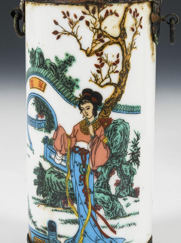 Drei Tiger in verschiedenen Haltungen und zahlreiche Schriftzeichen. Glasur teils fein krakeliert. / Darstellung einer Dame in Gartenlandschaft, Schriftzeichen. Altersspuren und Patina.