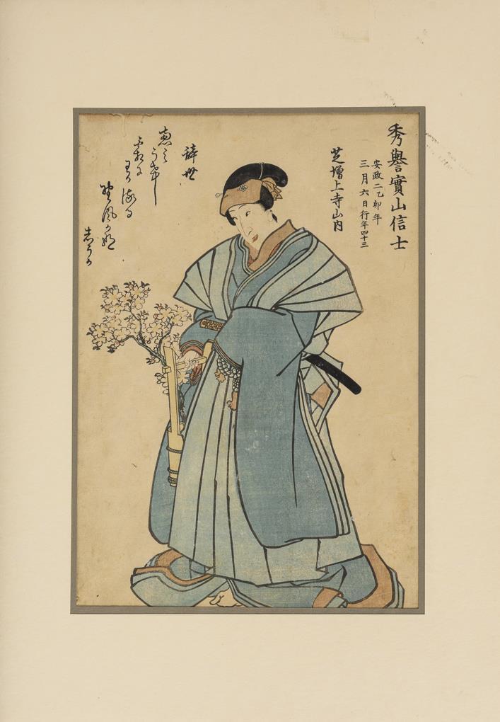 Yoshitaki: Schaupieler in der Rolle des Jussako, Osaka-Schule, Chuban-Format. Ca. 25 x 19 cm. / Kunisada: Die Dichter Sojo Henjo und Otomo no Kuronushi, ca. 1830, Verlag: Yamagushiya Tobei. / Yoshitaki: Der Schauspieler Mimaso Daigoro als Musashibo Benkei, in der Serie: Mitate Iroha Tatoe. Osaka-Schule, Chuban-Format. / Unsigniert: "Shinie", Gedächtnisbild für einen Schauspieler, 1856. / Tosai: "Porträt des Schauspielers Onoe Kikugoro V. in einer Sakeschale". Ein Schriftblock unkenntlich gemacht. / Ichiyeisai Yoshiiku: Die Schauspieler Ichikawa Raizo, Bando Uzayemon, Nakamura Kunnanosake in Rollen von Mönchen. Ca. 35 x 24 cm.