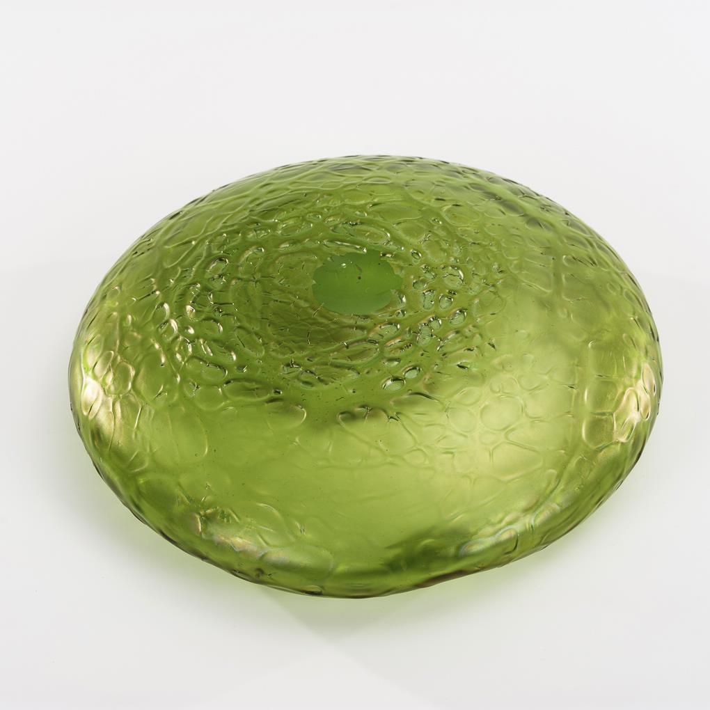Grünes, mit farblosen Fäden netzartig umsponnenes Glas, irisiert. Ø 21 cm.