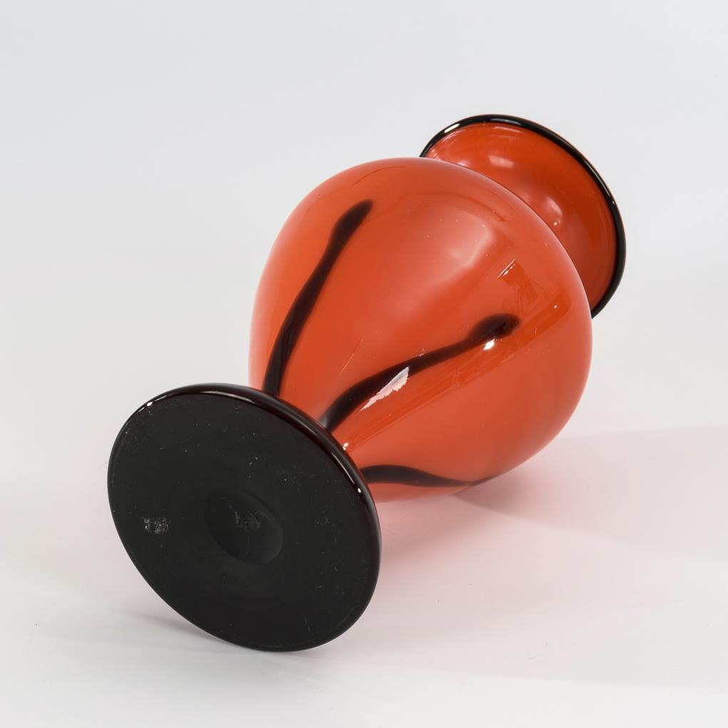 Rotes, farblos überfangenes Opalglas und partiell auberginefarbener, streifig verzogener Überfang, aufgeschmolzener schwarzer Opalglasfaden am Mündungsrand. H 21,5 cm.