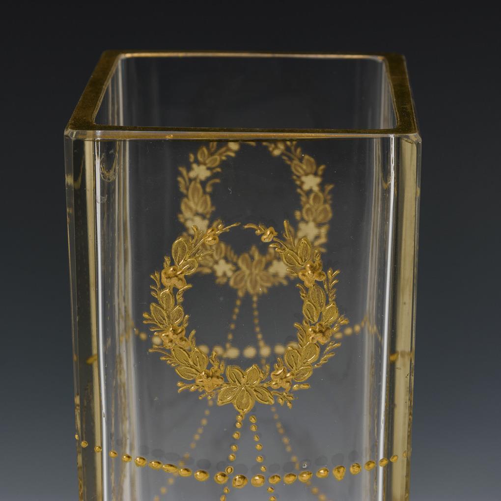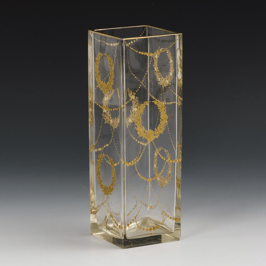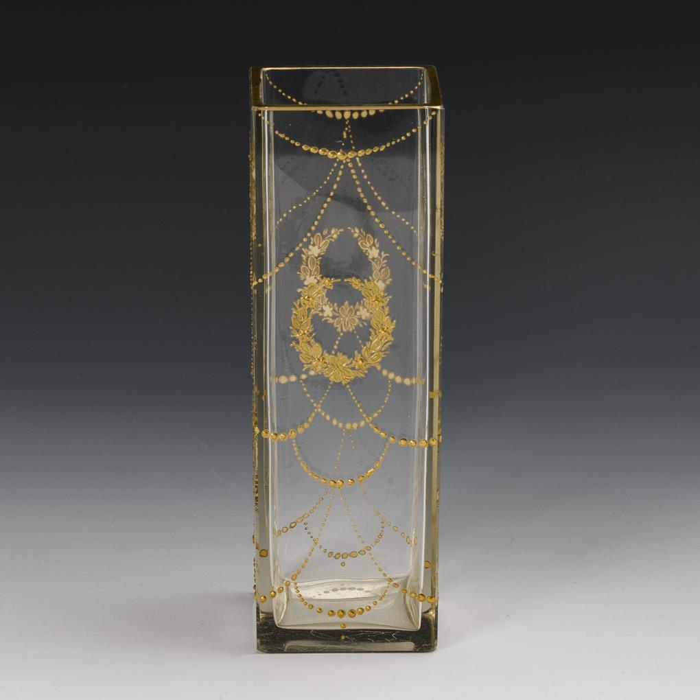 Farbloses Glas, Reliefemail, Goldstaffage. H 20 cm.