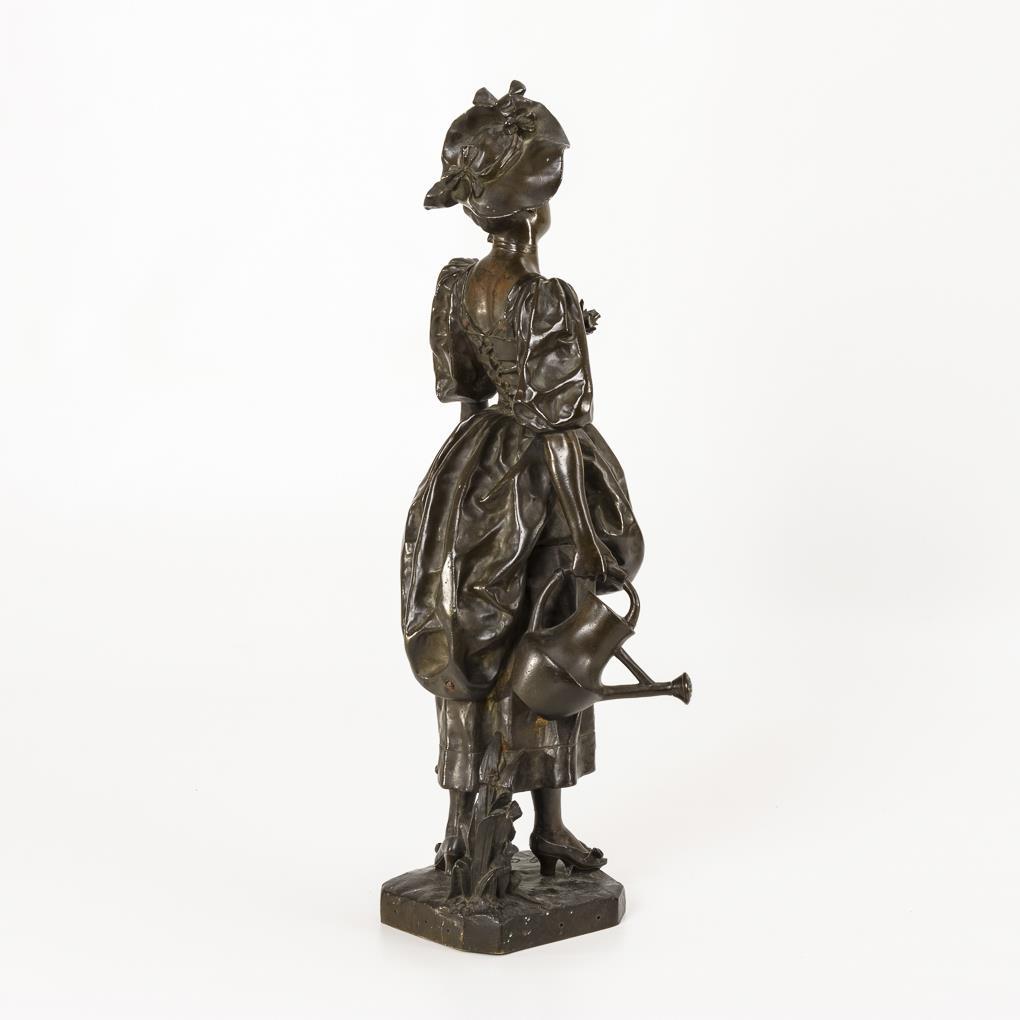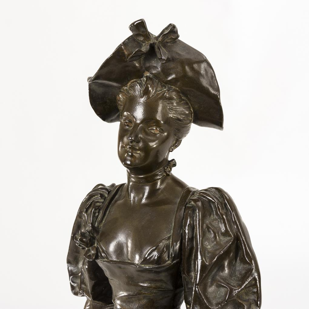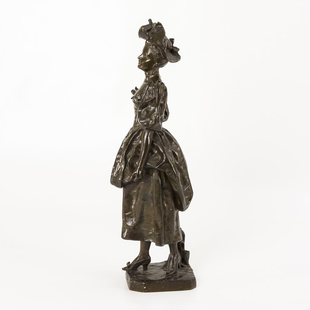 Schreitende junge Frau in eleganter Bekleidung wohl auf dem Weg zu ihren Blumen. 2 Ausbesserungen, fehlende Attribute, Alters-/Gebrauchsspuren.