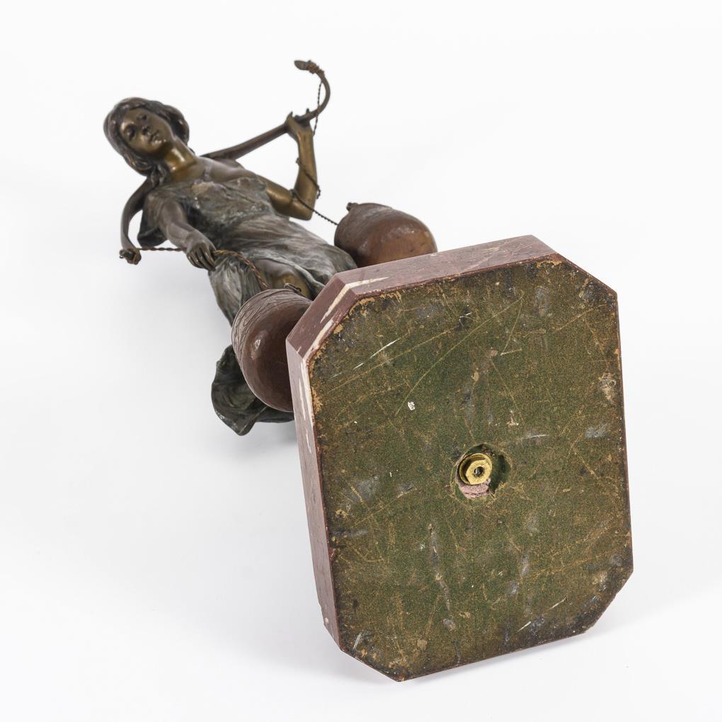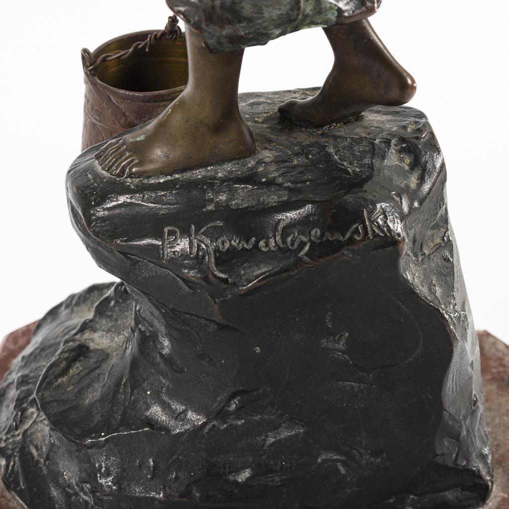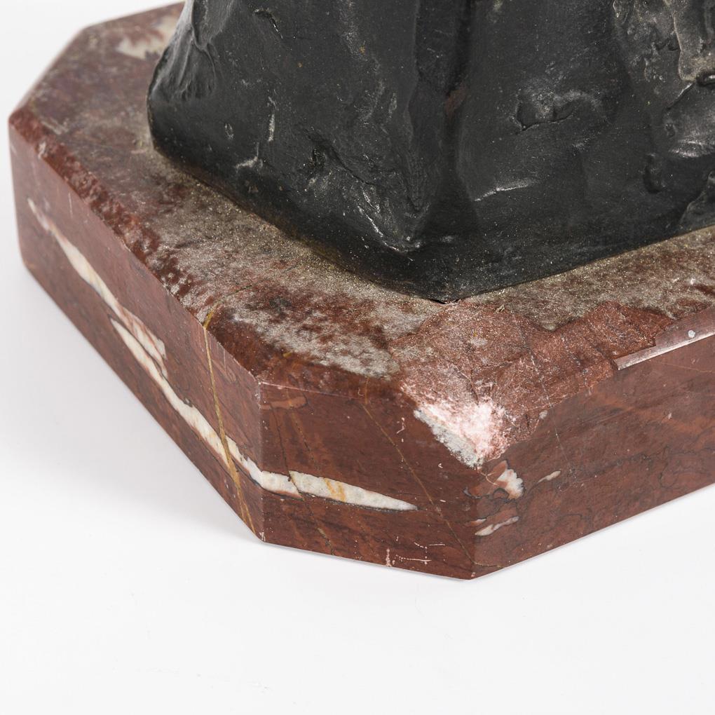 Bronze dreifarbig patiniert, rote Marmor-Plinthe. Bezeichnet. H 40,5 / 43,5 cm.