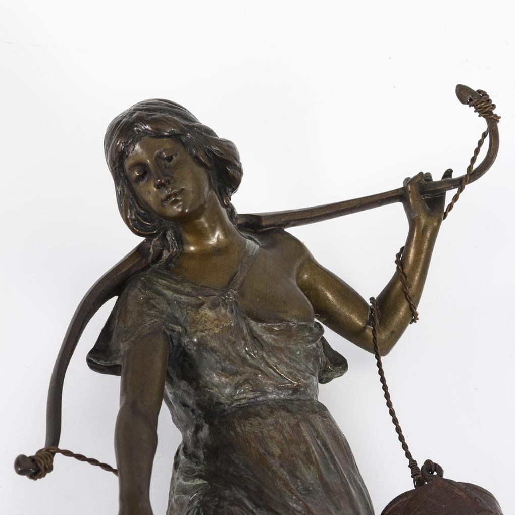Junge Frau im teils herabgerutschten Gewand, die einen Eimer von ihrem Tragejoch zum Wasser hinablässt. Einige Alters-/Gebrauchsspuren.