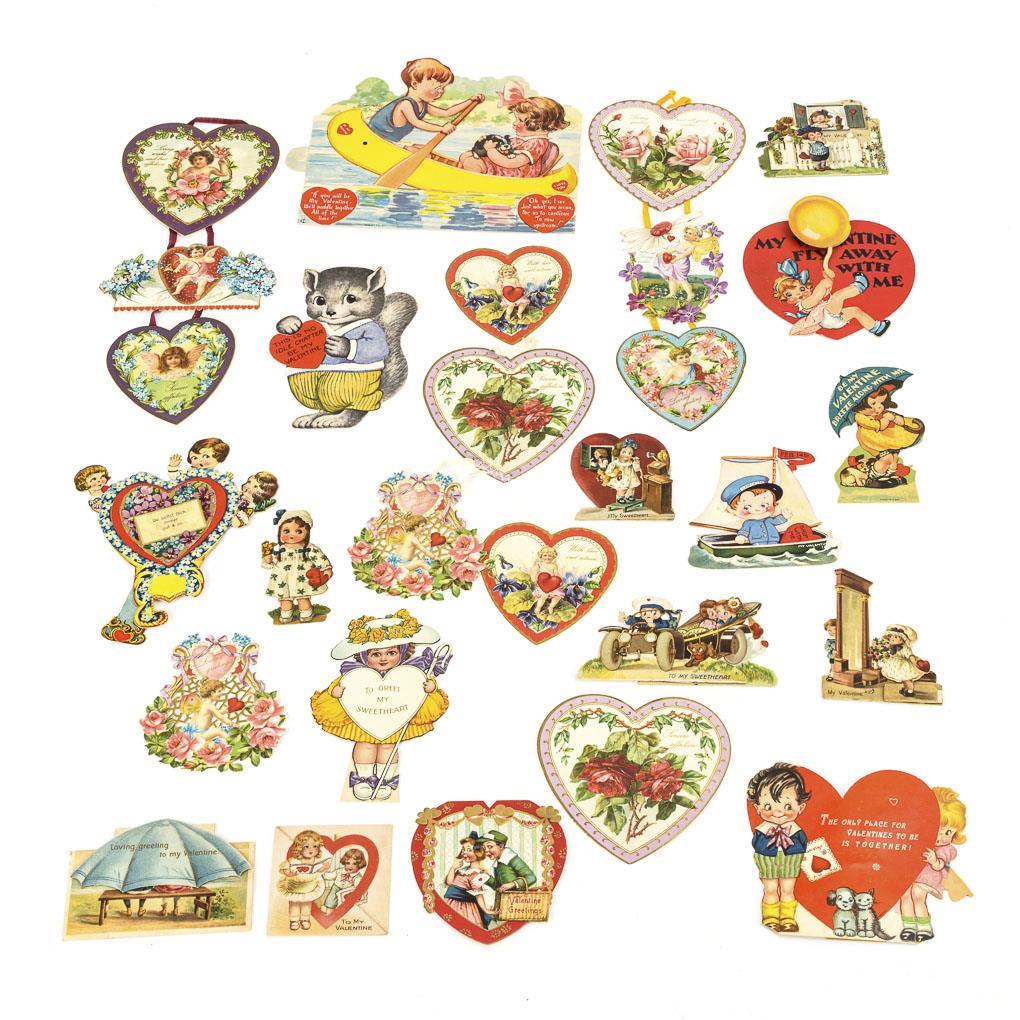 Ca. 20 farbig bedruckte, teils mehrteilige und bewegliche Kärtchen, Aufhänger und Aufsteller mit Liebesgrüßen: "To my Valentine", "To my Sweetheart" etc. Teils mit Defekten.