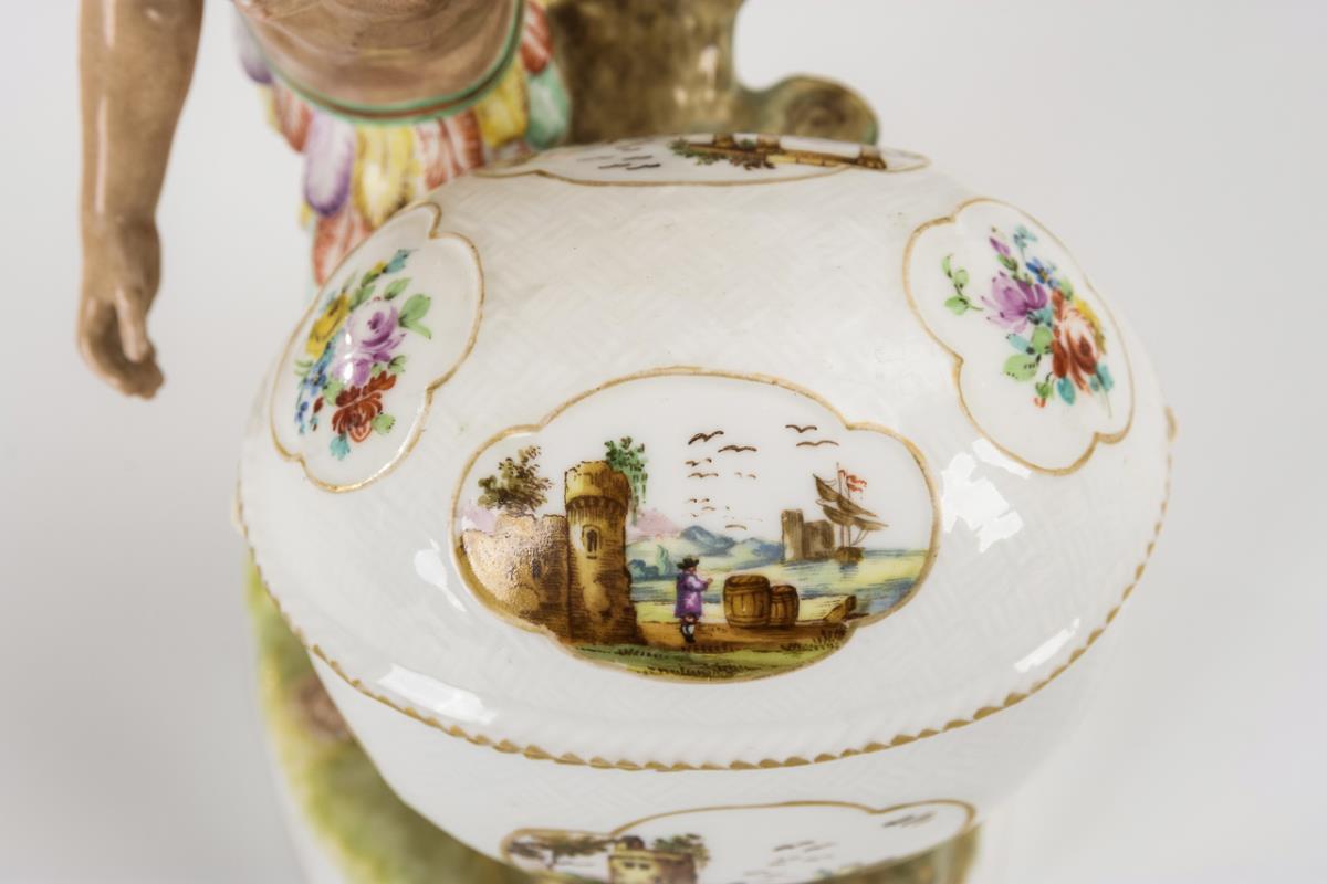 Auf einem Stein stehende Dose mit Landschafts- und Kauffahrteimalerei, daran ein Indianer mit Zitrone als Allegorie für Amerika bzw. eine Afrikanerin als Allegorie für Afrika stehend. 1x Finger der rechten Hand bestoßen, kleiner Chip an 1 Dosenrand, minimaler Goldabrieb.