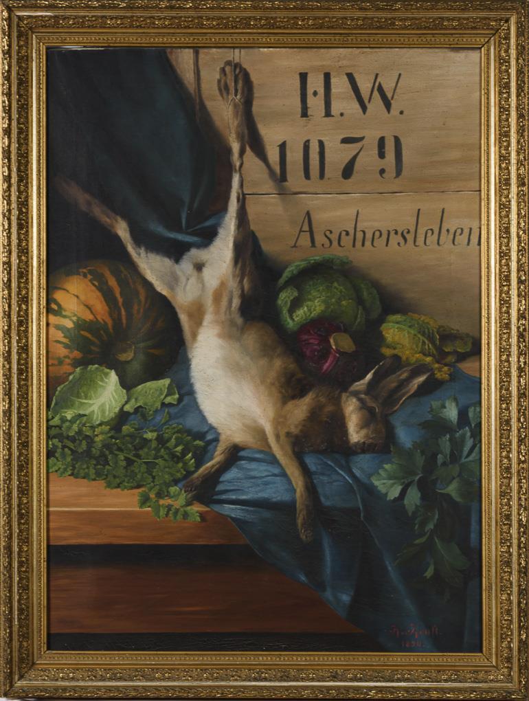 Kürbis, Salatkopf und Rotkohl neben einem Hasen vor einer Kiste. Leichte Altersspuren.