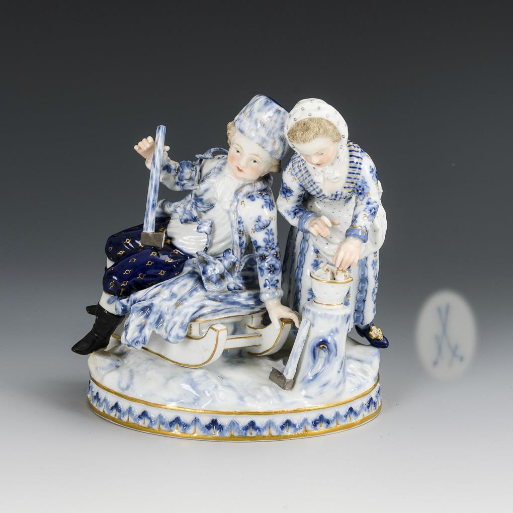 Kinderpaar mit Schlitten und Feuerschale. 2 Blätter bestoßen, linker Fuß des Knaben restauriert.