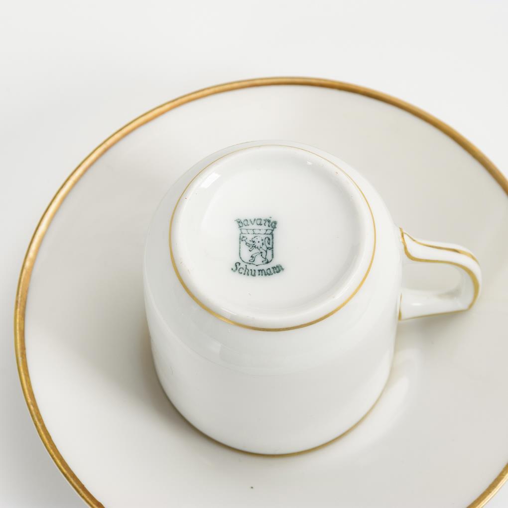 Schwarzes Dekor, Goldstaffage. H Tassen 5 cm, Ø Untertassen ( 1 Untertasse ergänzt) 11 cm.