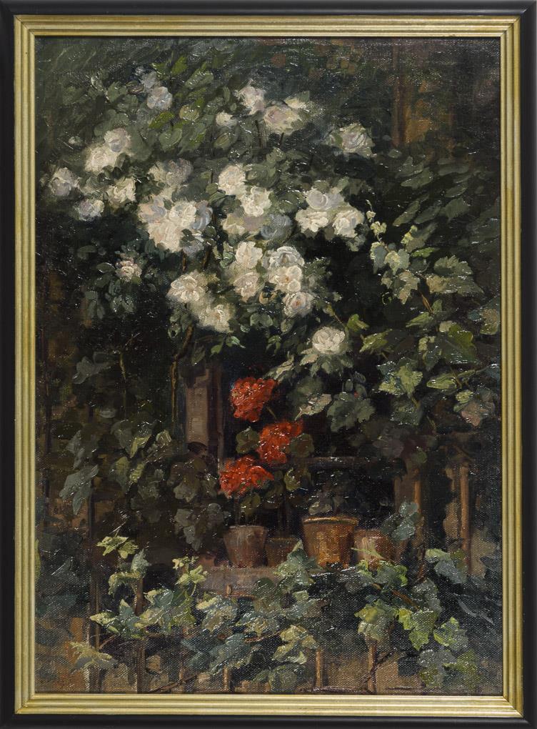 Undeutlich signiert: Kletterrosen vor dem Fenster