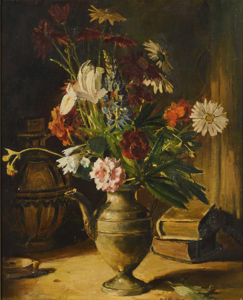 In leuchtenden Farben blühende Pflanzen in einer Metallkanne neben Büchern und Krug. Leichte Altersspuren.