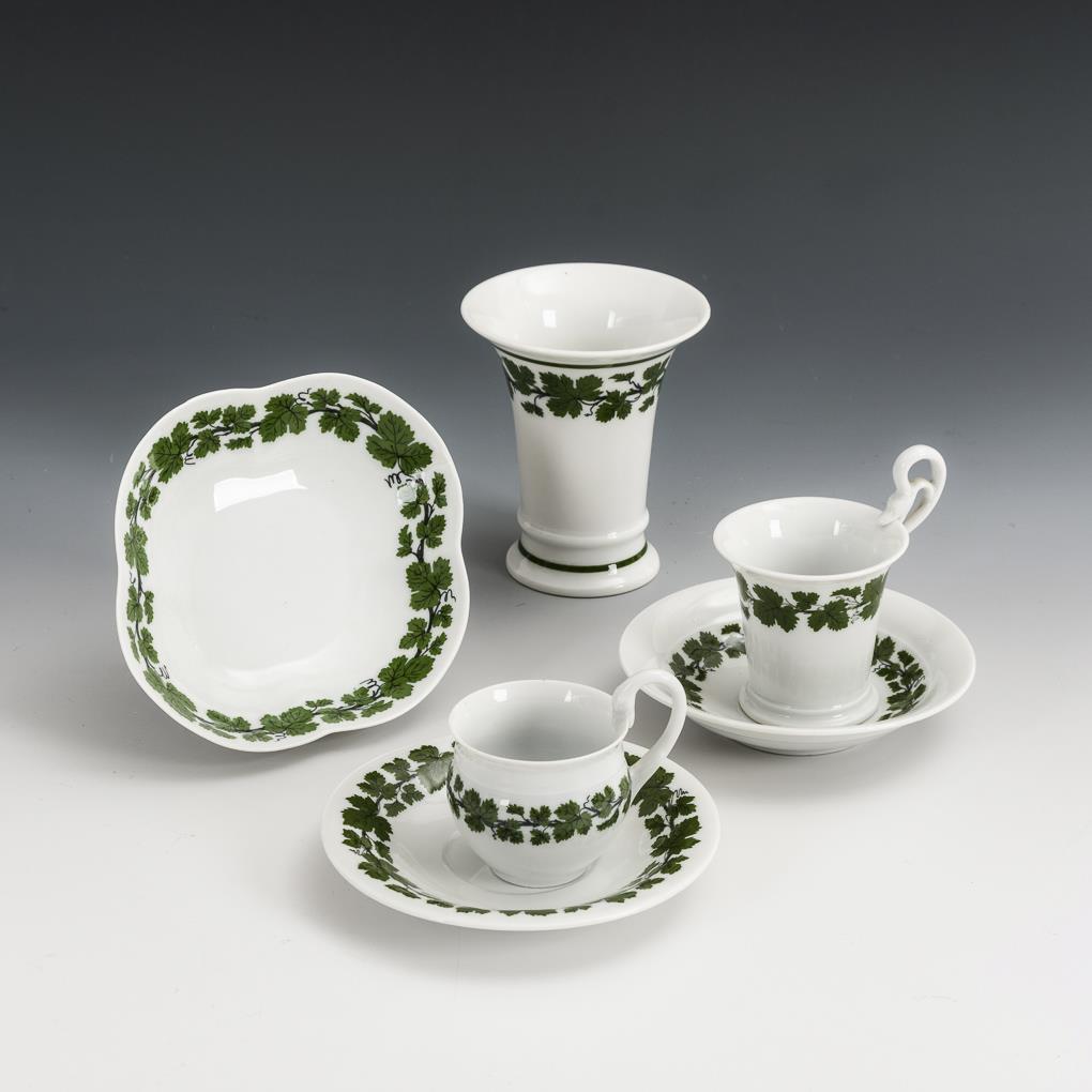 2 Mokkatassen, Vierpassschale und Kratervase mit Weinlaubdekor. Meissen.
