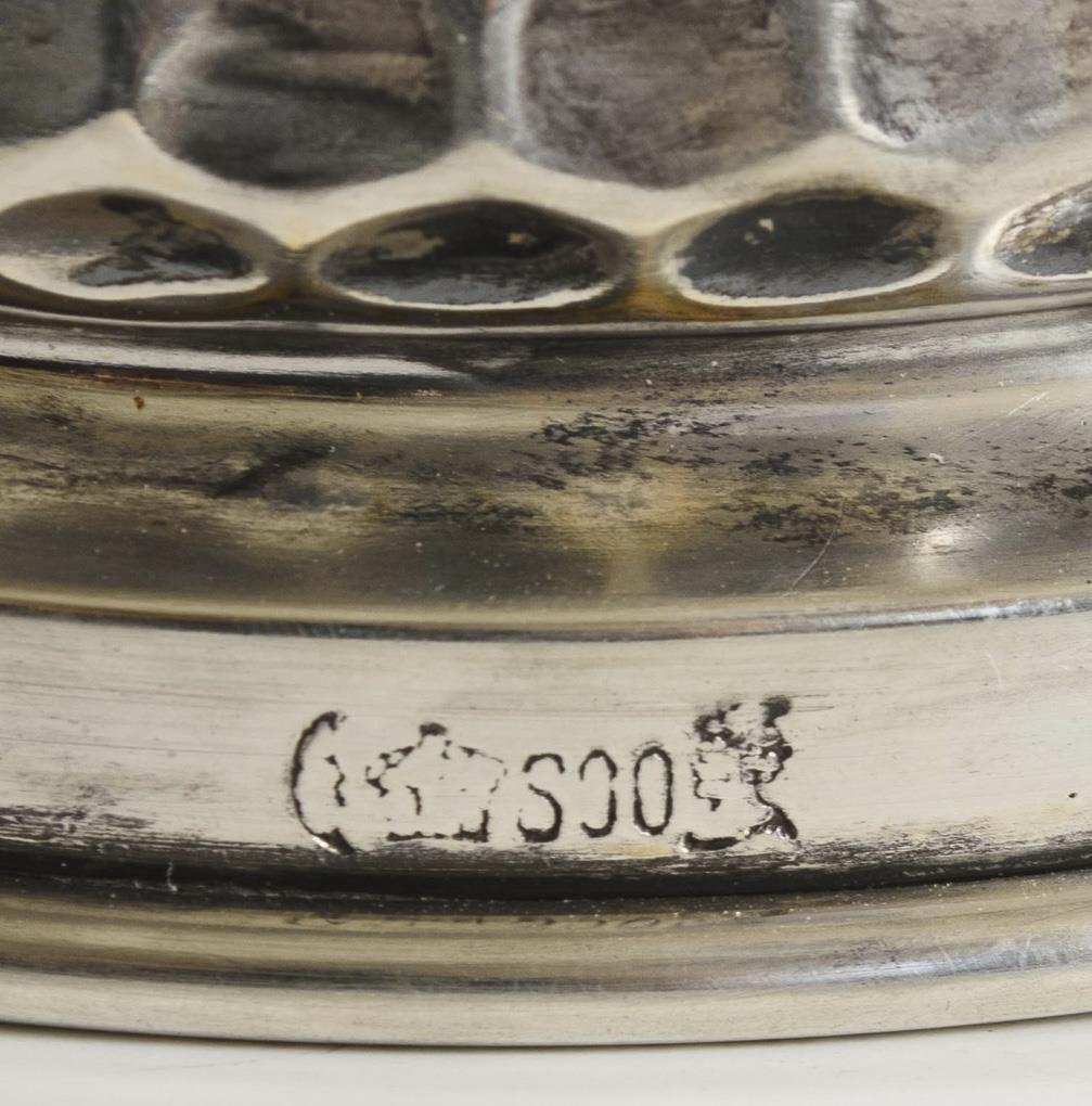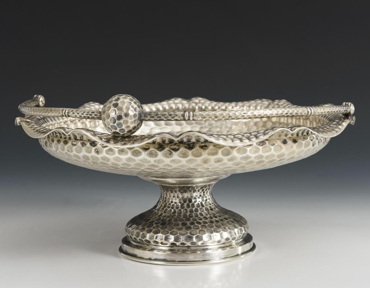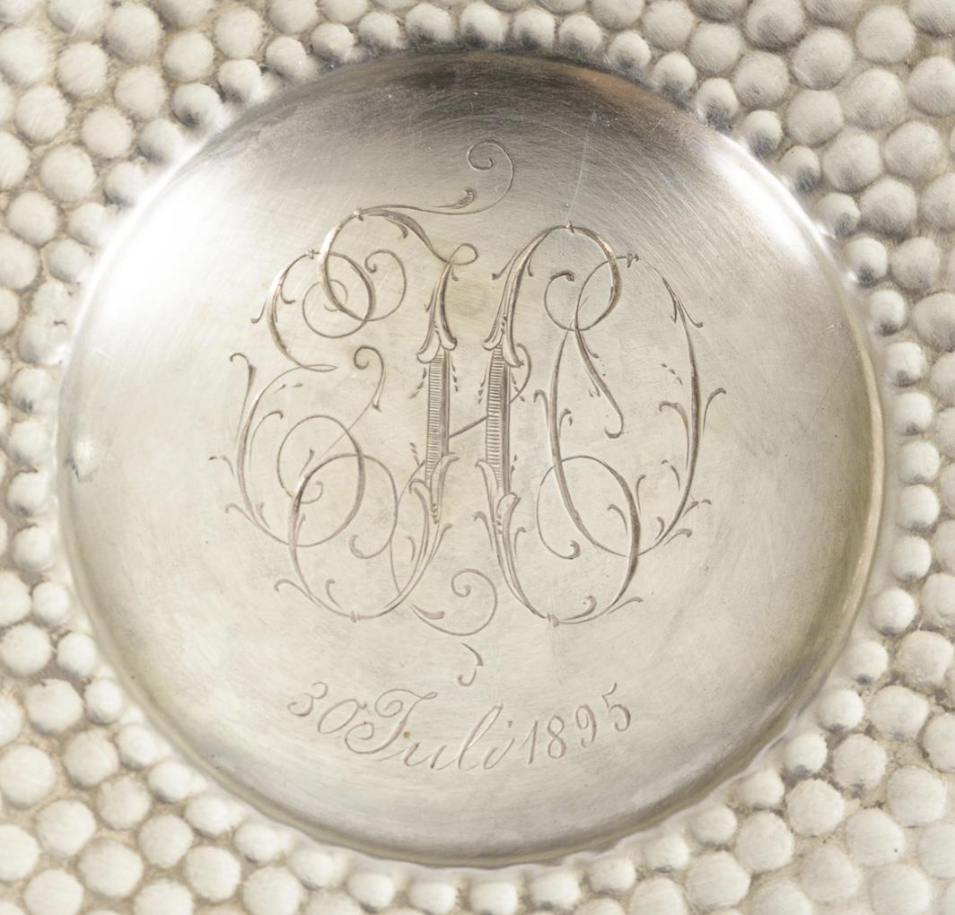 Runder Aufsatz im Hammerschlagdekor, mit Bügelhenkel und Gravur im Spiegel "EHO 30. Juli 1895".