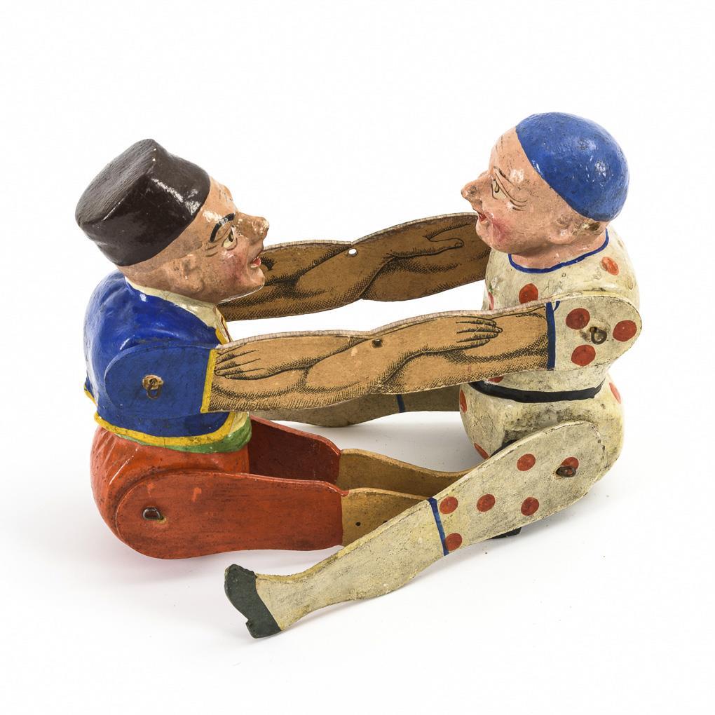 2 lustige Figuren im Kampf, mit gesplinteten Gliedern. Kleine Farbdefekte, Aufhängung fehlt.