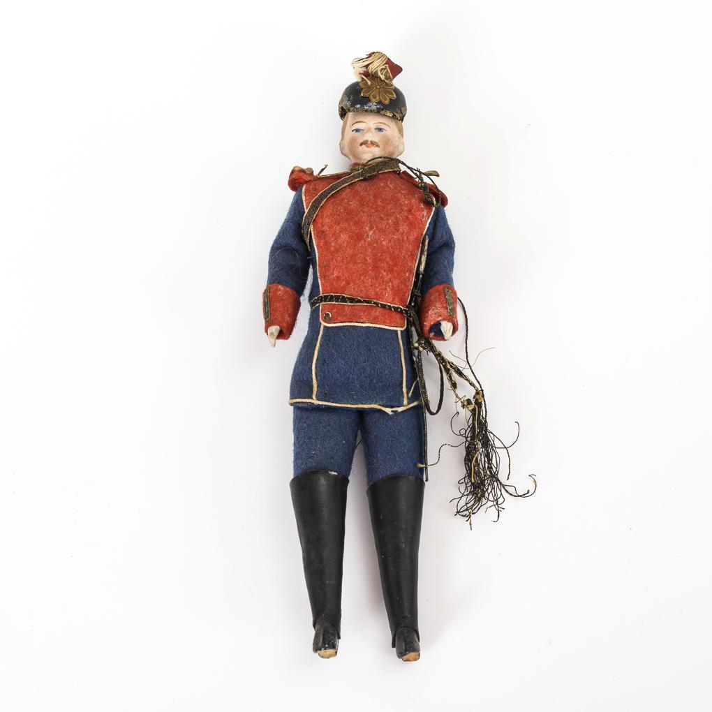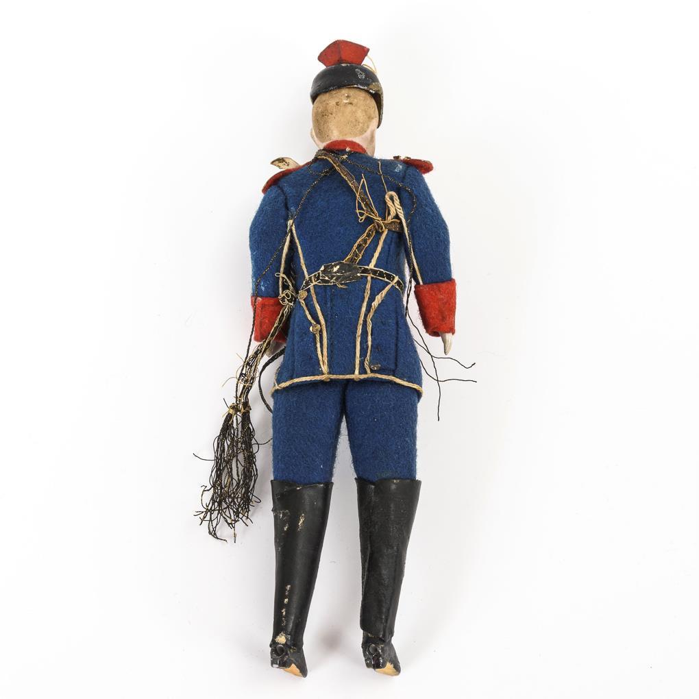 Schlanker Offizier mit gemaltem Schnurrbart und Tschapka. In rot-blauer Filzuniform. Helm mit kleinen Bestoßungen, Gamaschen/Stiefelschäfte eventuell ergänzt.