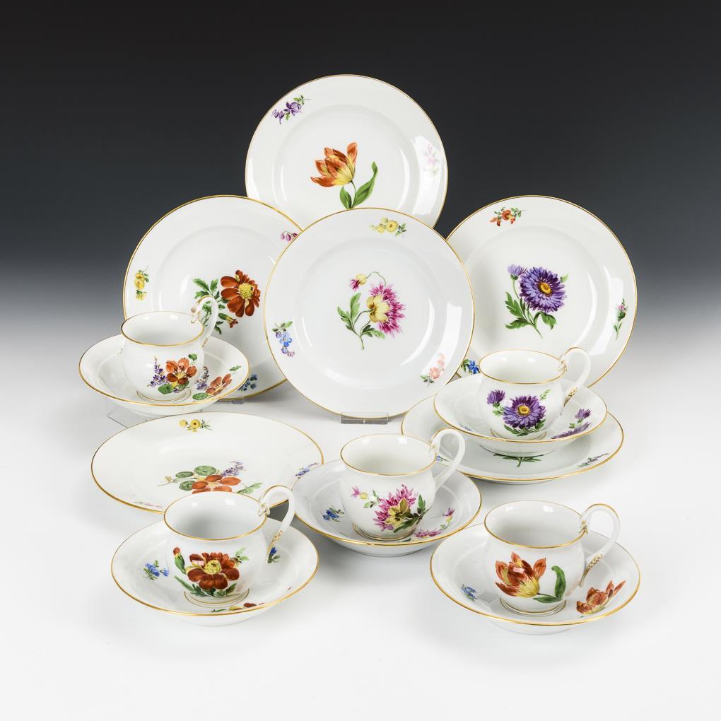 5 Gedecke + 1 Teller mit Blumenmalerei. Meissen.