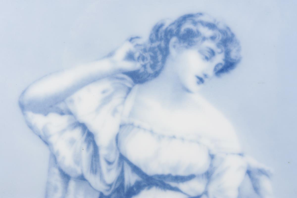 Rechteckige Platte mit der Darstellung einer jungen, in einen Handspiegel schauenden Frau. Platte minimal verzogen.