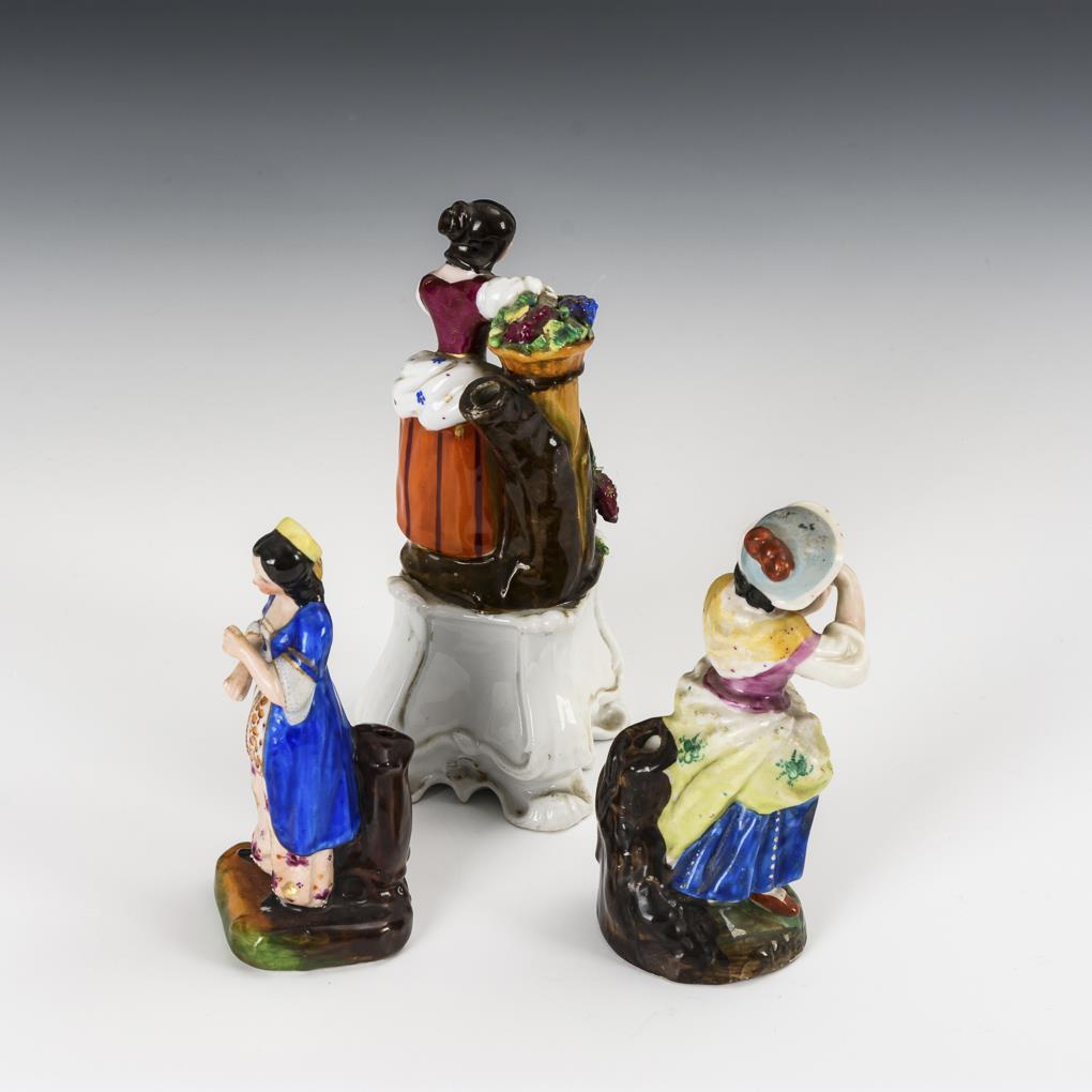 Knabe als Jäger, Knabe als Trommler, Mädchen mit Früchtekorb, Mädchen mit Tambourin, orientalische Dame und Gärtnerin auf Sockel. Davon 3x Lampenhalter-Figürchen. 1x Bestoßung am Sockel, partiell etwas berieben.