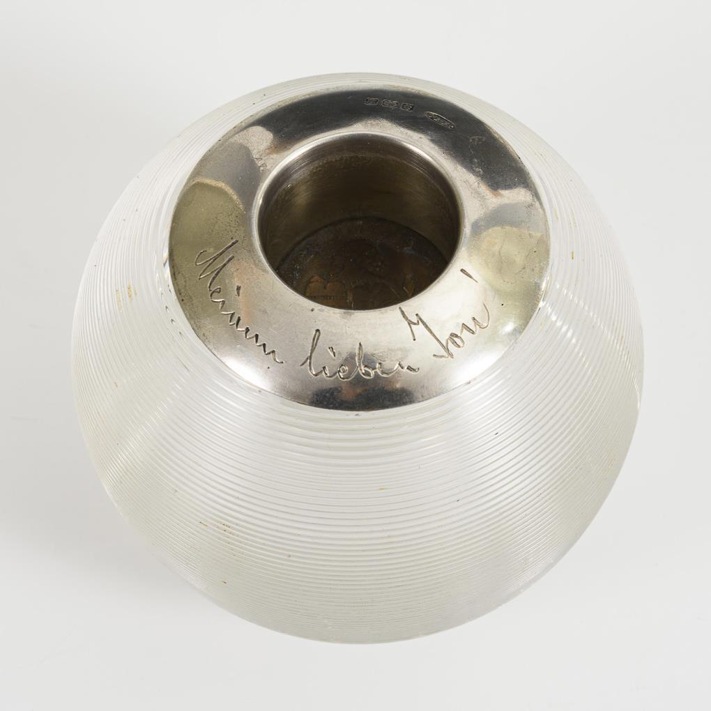 3 kugelformige Ascher: 1x Porzellan mit Dekor "Roter Drache", 2x Glas (davon einer mit Widmungsgravur). Silber teils etwas gedellt, Einsatz beim Meissen-Ascher lose.