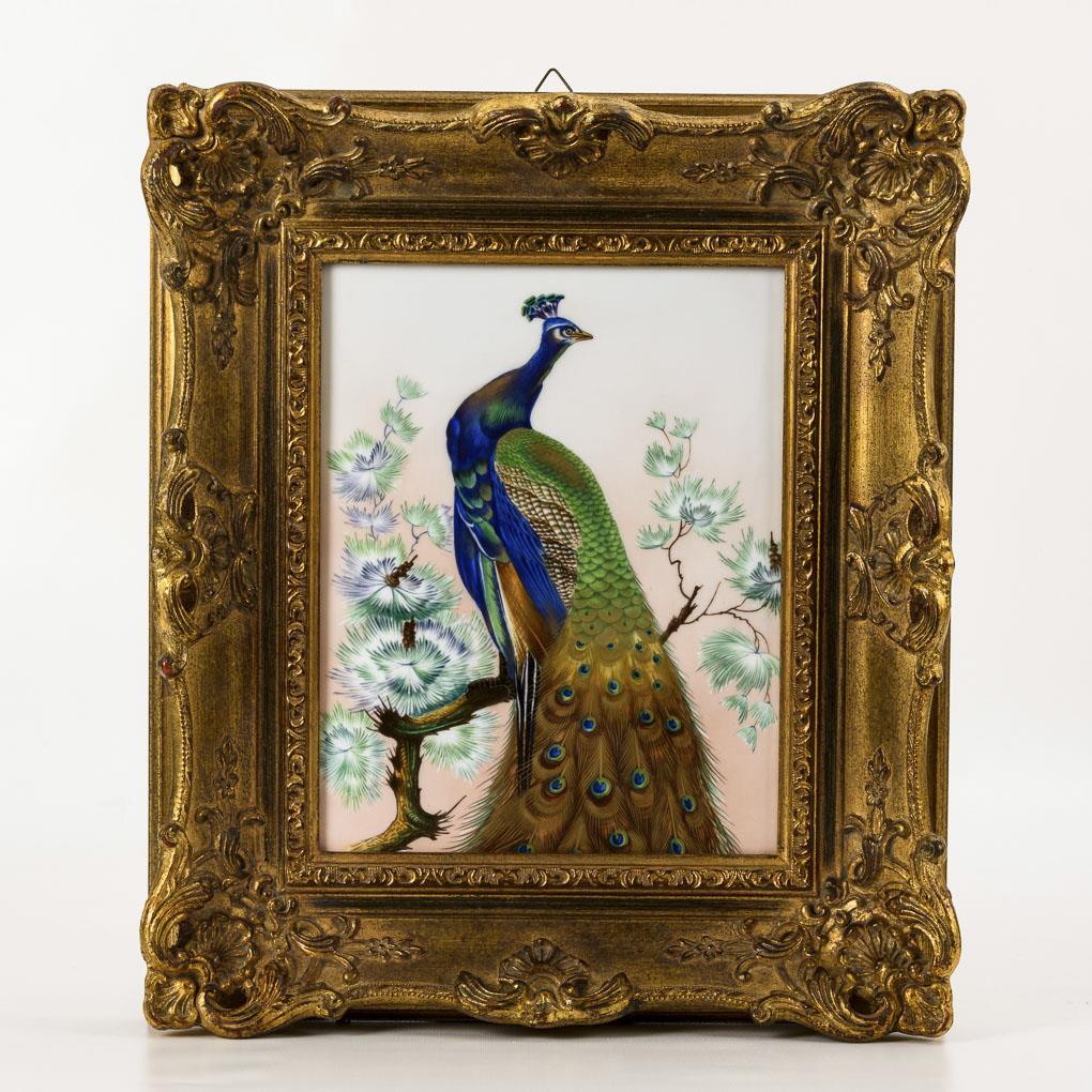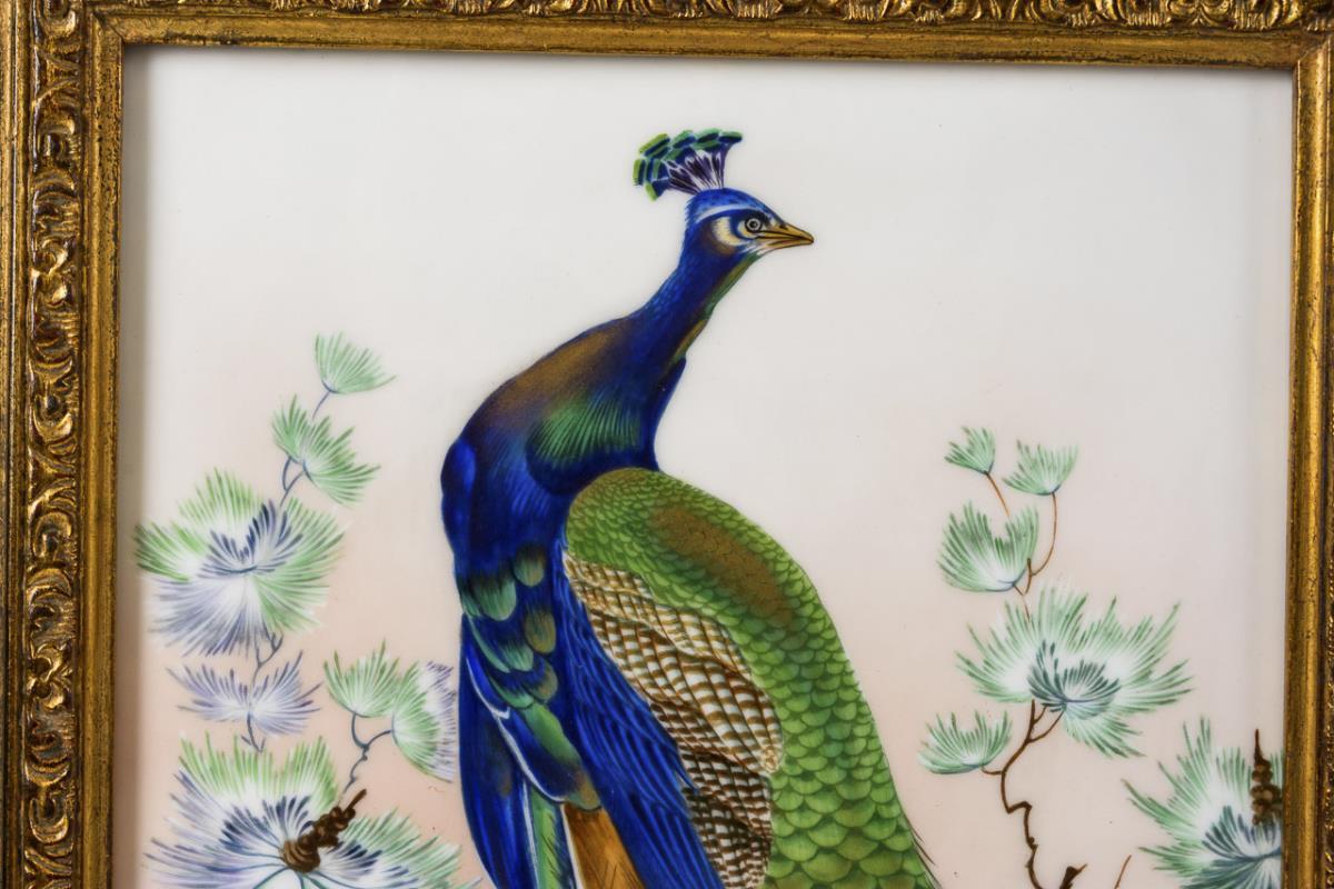 Rechteckige Platte mit der Darstellung eines auf einem Weidenast sitzenden Pfaus.