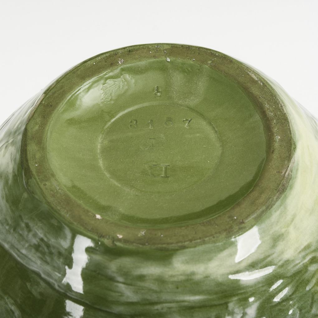 Grüner, glasierter Scherben, reliefartig aufgetragene, weiße Farbschicht. H 21,5 cm.