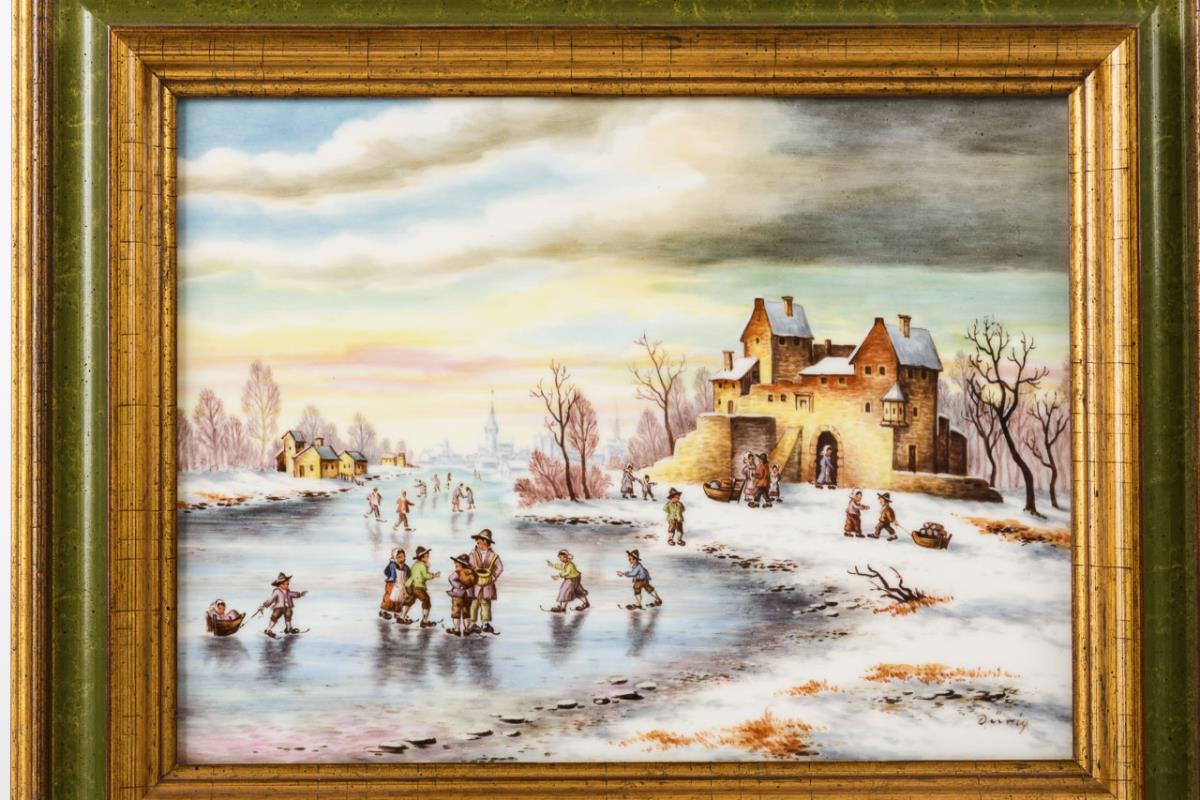 Rechteckige Platten mit der Darstellung eines winterlichen Ortes mit schlittschuhlaufenden Menschen.