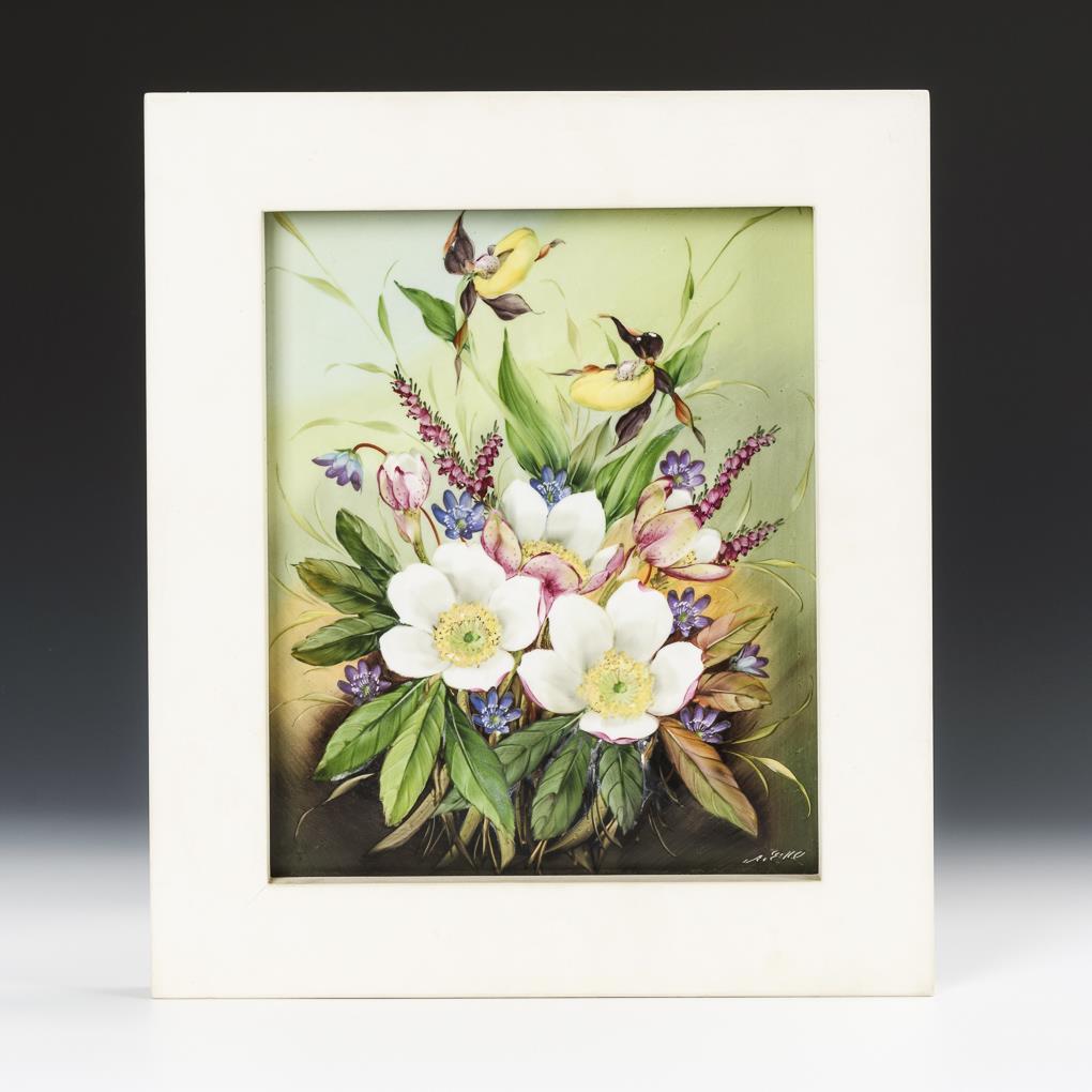 Rechteckige Platte mit einem Blumenstrauß mit Christrosen, Orchideen und Heidekraut.