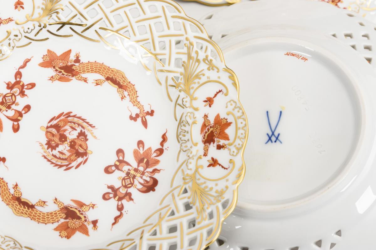 6 Durchbruchteller mit Drachenmalerei. Meissen.