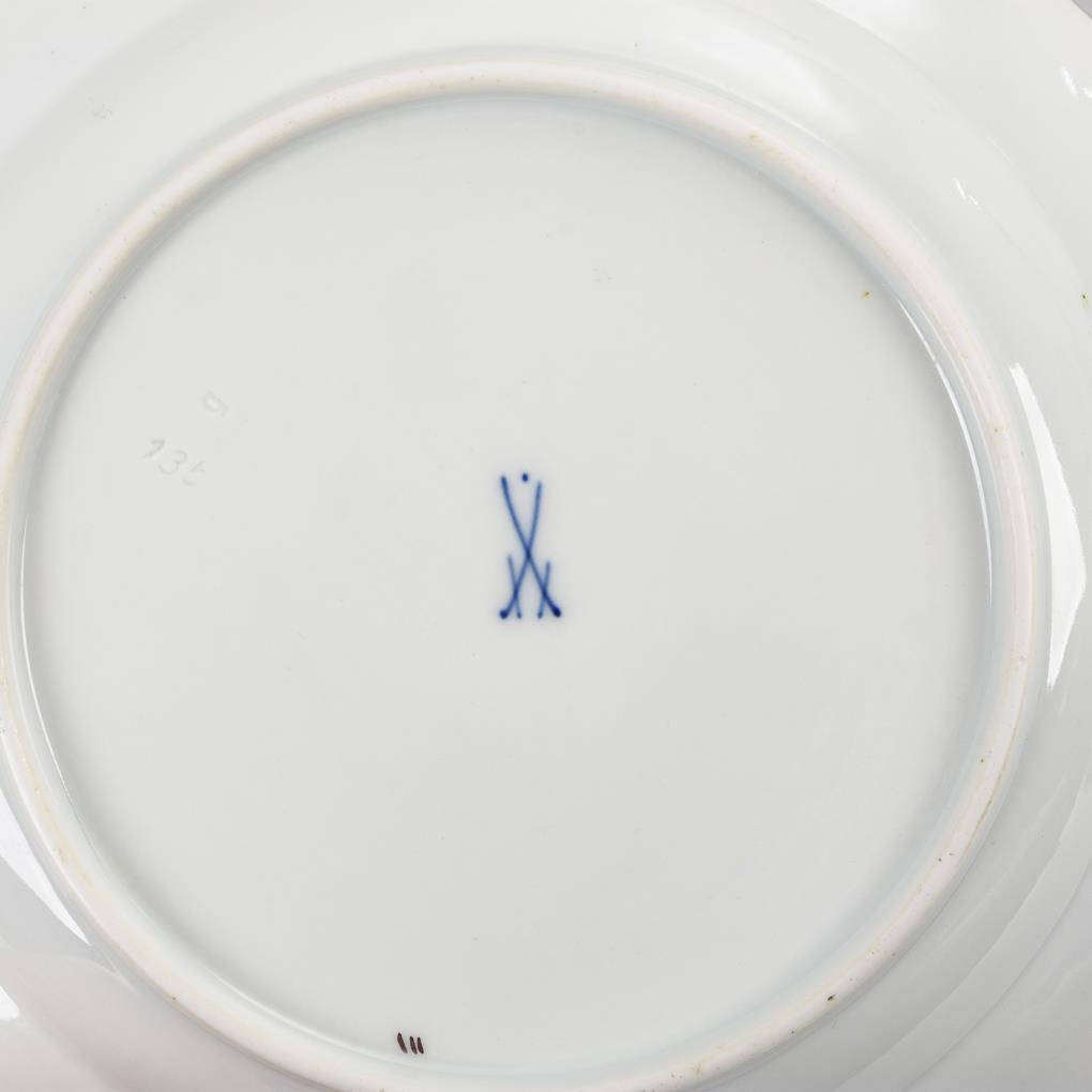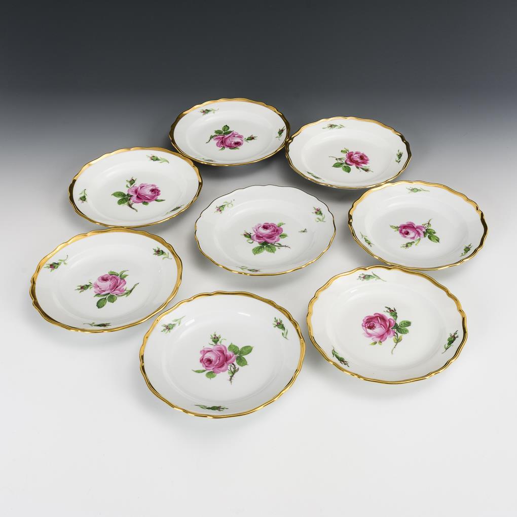 Form "Neuer Ausschnitt". Teller mit breitem Goldrand (davon 1 Teller etwas verschieden) und Rosenmalerei.