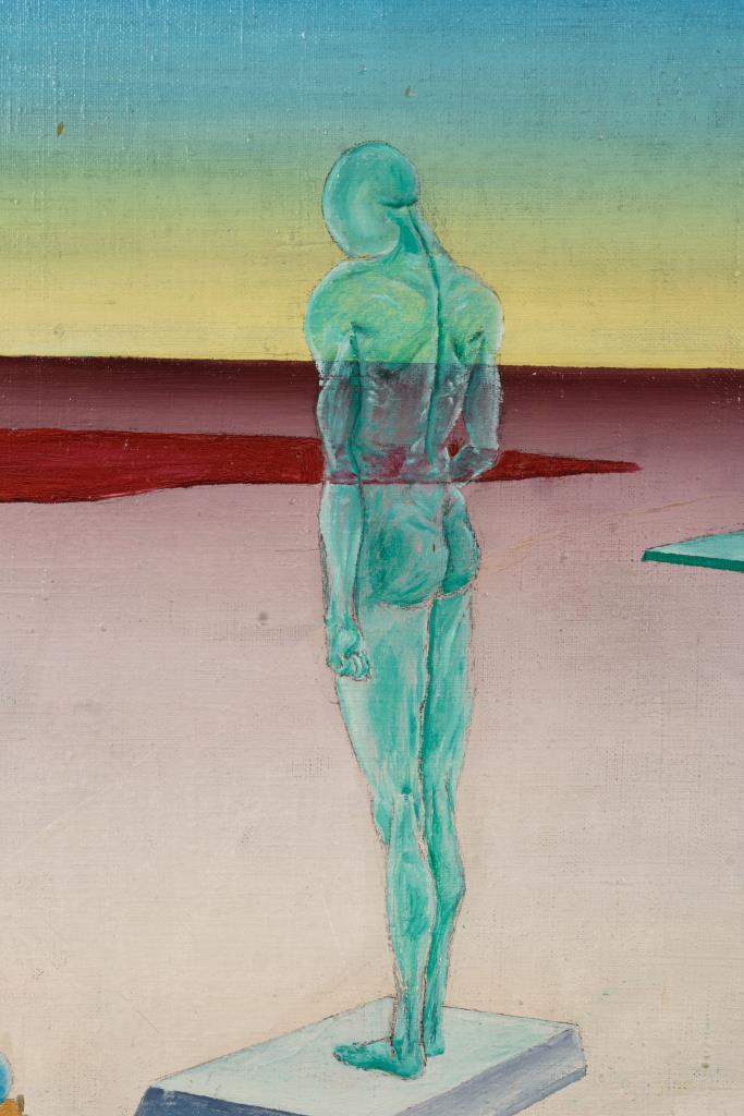 Surrealistische Szene mit kleinem Kind nahe einer gläsernen Skulptur sowie einer "göttlichen" Hand, welche ein Glas gekippt hält, darunter ein roter See.