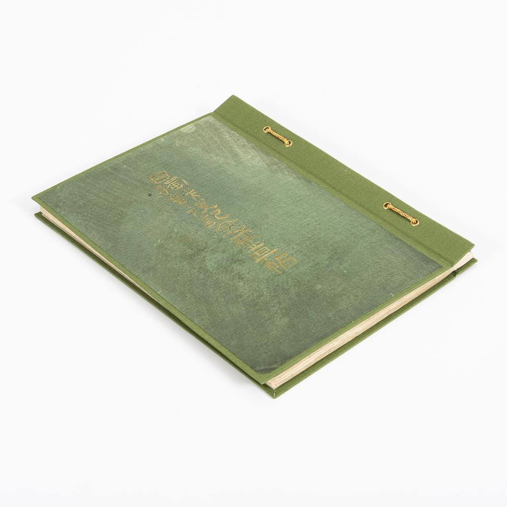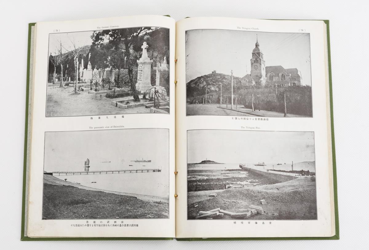 Band in japanischer Sprache mit knappen englischen Untertiteln. 120 Seiten mit je zwei Fotodarstellungen militärischer oder kolonialer Tätigkeiten auf chinesischem Gebiet. Unter anderem auch Ansichten aus Tsingtau. Unter Verwendung des alten Einbandes in Mappe gebunden.