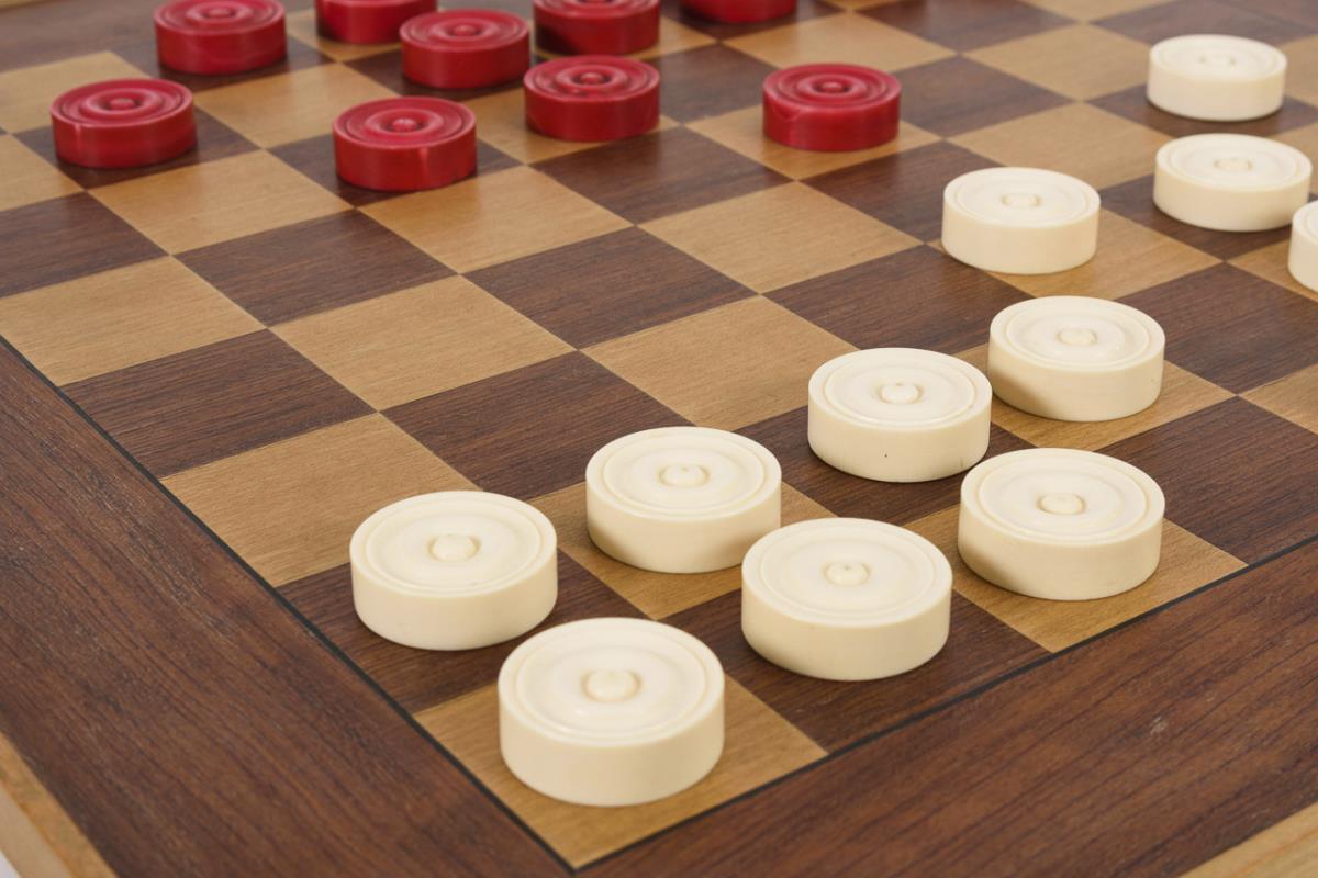 Backgammon-Spielsteine in Schatulle und Schachbrett.