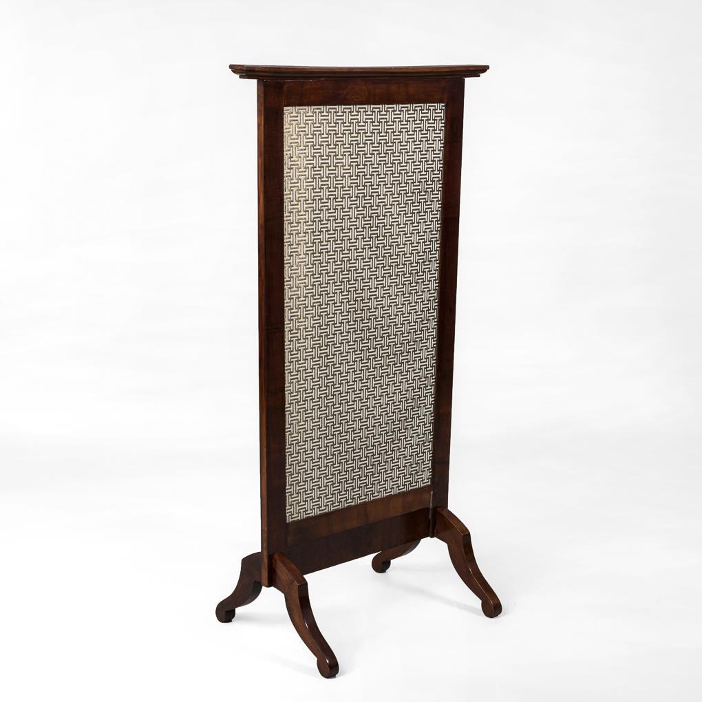 Raumteiler im Japonismus-Design auf volutierten Füßen, heller Bezug mit geometrischem Rapport. Minimale Alters-/Gebrauchsspuren, restauriert, einige Furnierblasen, Leimspuren im Fußbereich, Bezug passend ergänzt.