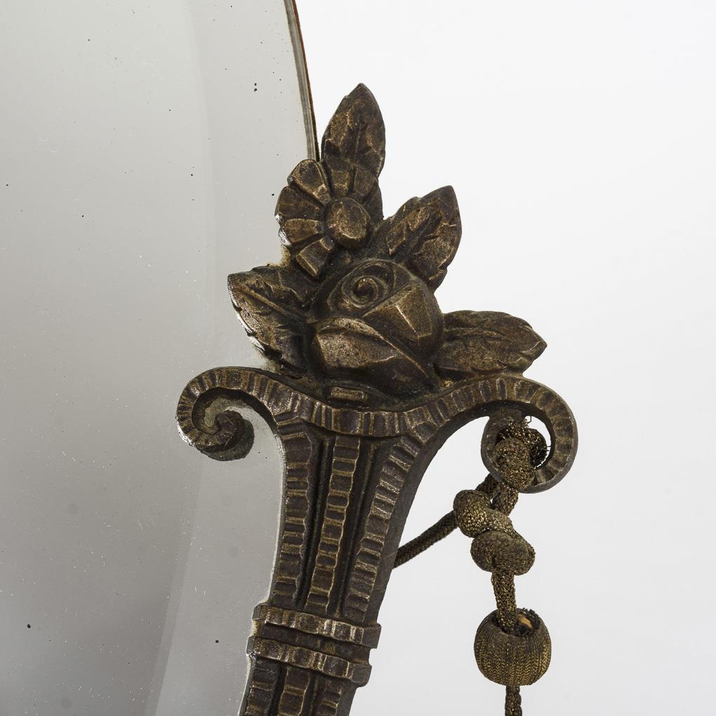 Ovales Spiegelglas in der Halterung aus schlanken Füllhörnern mit Blüten. Punktuelle Blindflecken am Spiegelglas.