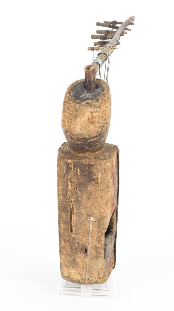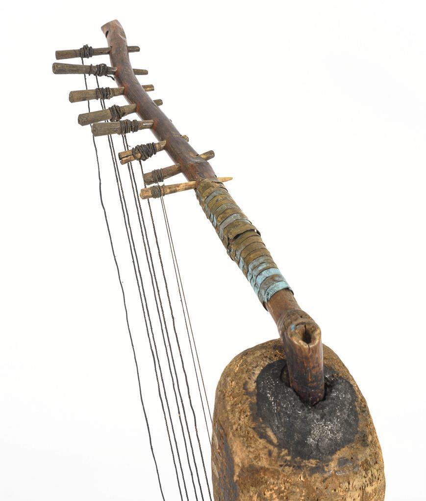 Lederbezogener Hohlkörper in stilisierter Menschenform mit 9 Saiten, die durch Wirbel zu spannen sind. Ein Wirbel mit Saite fehlt. Alters- und Gebrauchsspuren.