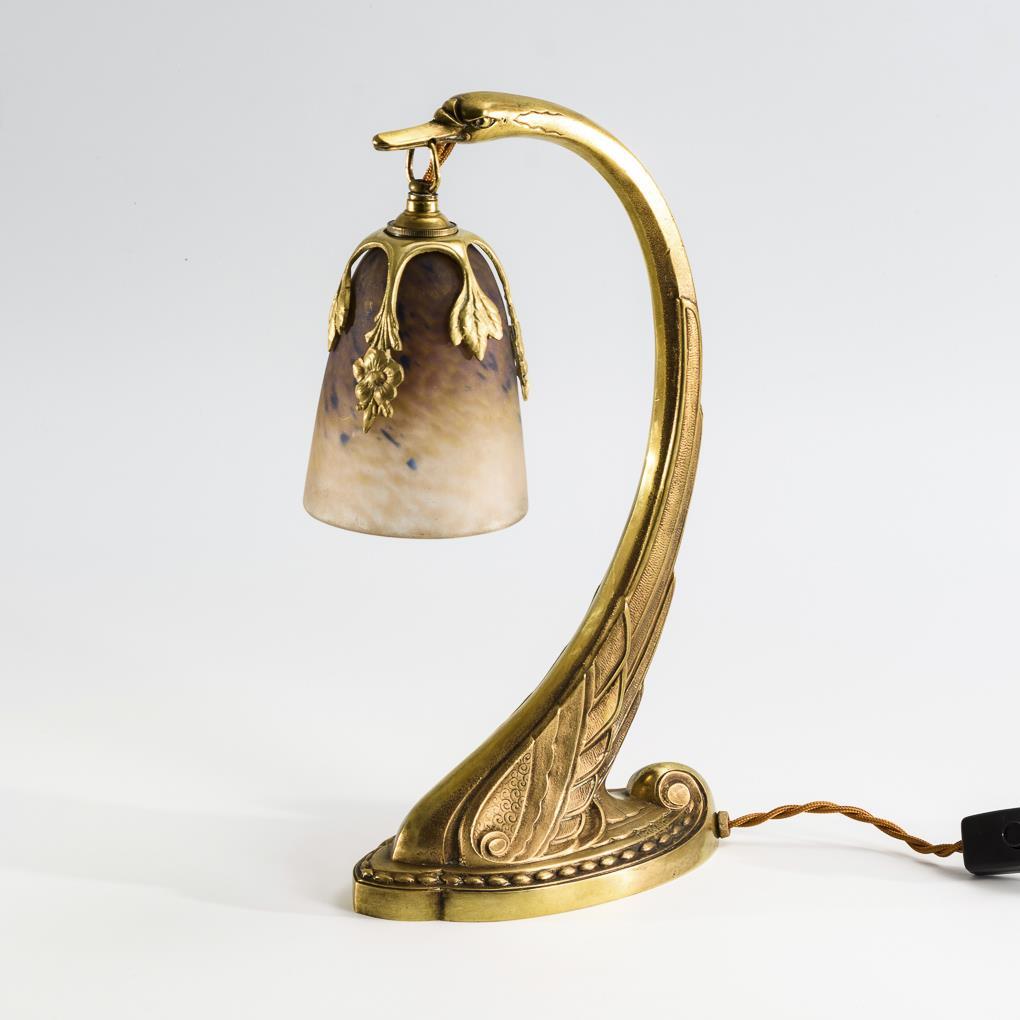 Gehängter Glockenschirm mit floraler Einfassung (H 12,5 cm). An gebogenem Schwanenschaft mit rautenförmigem Fuß. Elektrifiziert (Funktion nicht geprüft) .