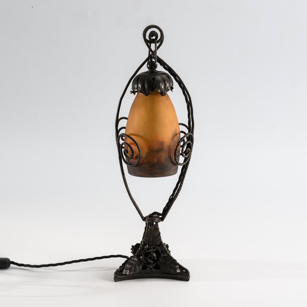 Glockenschirm, eingehängt in ein schmiedeeisernes Gestell mit Volutenzier sowie dreiseitigem Fuß mit plastischen Rosen. Elektrifiziert (Funktion nicht geprüft).