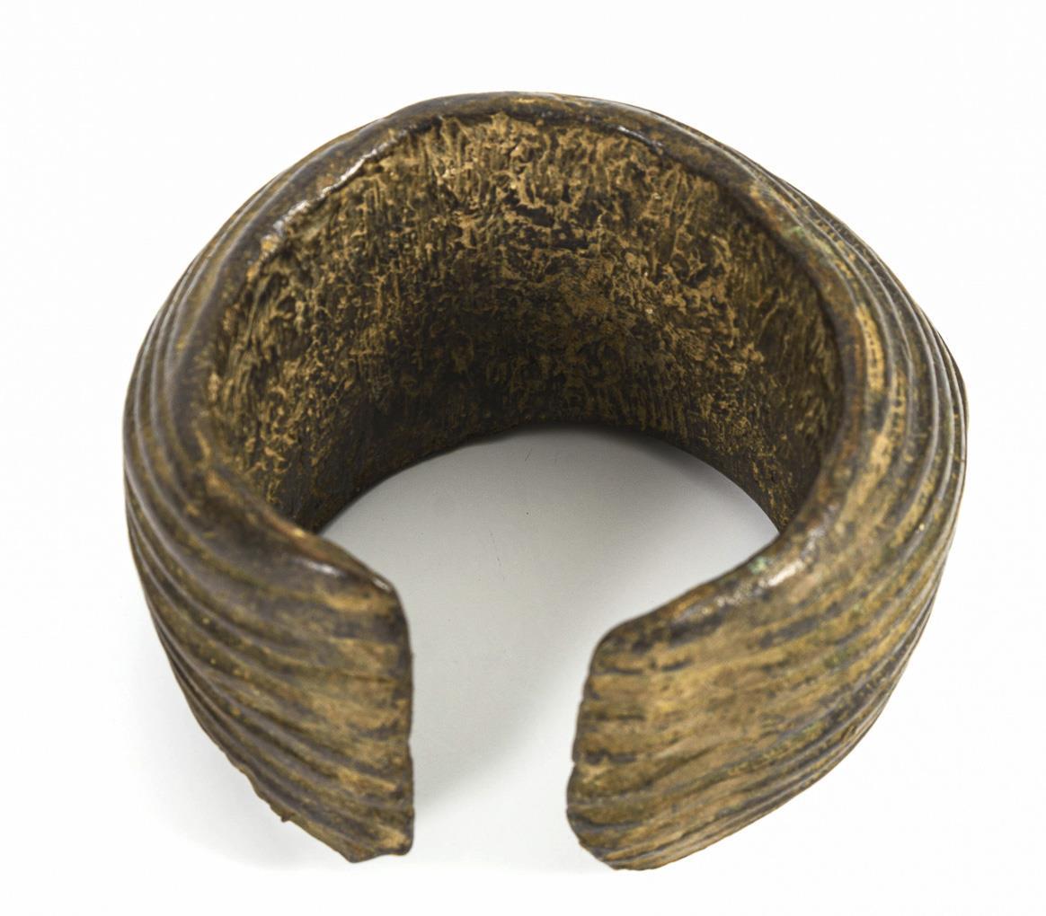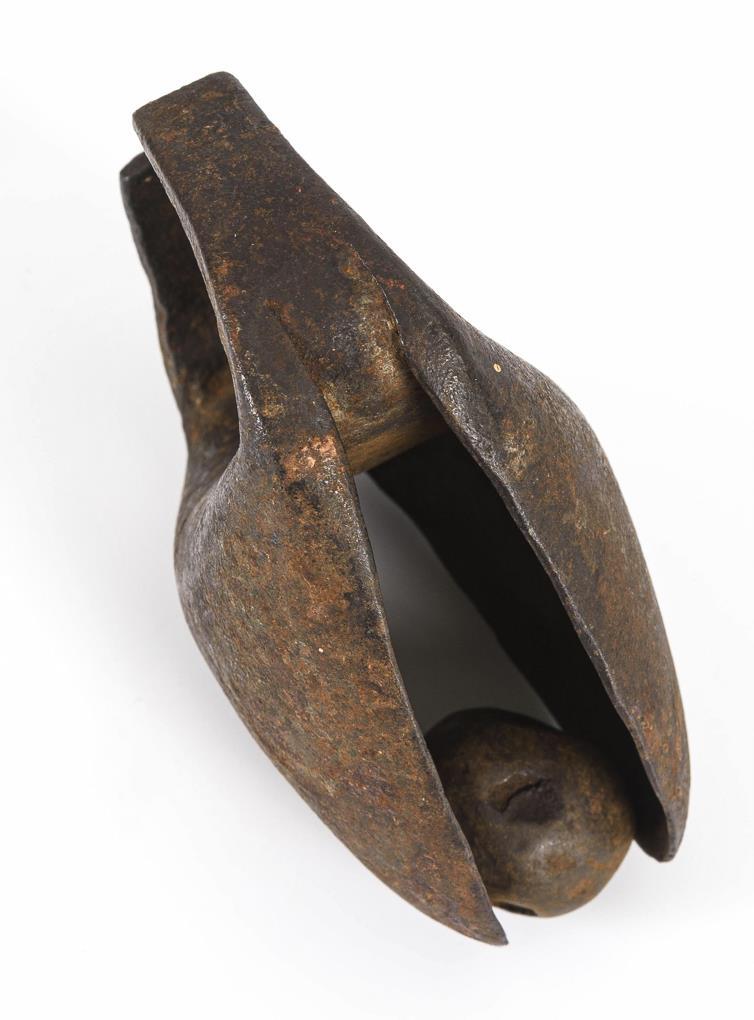 Schwere Spange mit mehreren Längsrippen. Massive Spange mit glatter Oberfläche. Schelle aus Eisen, in Dreieckform.